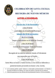 Pero la jornada del sábado 20 de noviembre será el plato fuerte de la celebración. A partir de las 11 h el Salón de Eventos acogerá la realización de juegos y actividades. A las 14:30 h tendrá lugar la tradicional comida de hermandad para coger fuerzas y realizar la recogida de educandos, empezando a las 17:30 h desde el Polivalente. Para acabar la jornada, a las 18:30 h se realizará una misa en honor a Santa Cecilia y los músicos fallecidos y a continuación la procesión de Santa Cecilia.