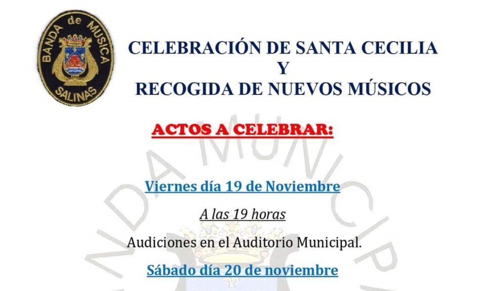 Este fin de semana será muy especial para la Banda de Música de Salinas ya que celebra la festividad de Santa Cecilia, patrona de los músicos, con varias actividades. Arrancarán con las audiciones el próximo viernes 19 de noviembre, a partir de las 19 h en el Auditorio Municipal.