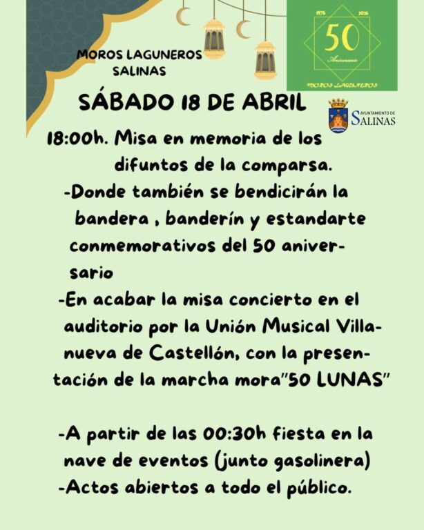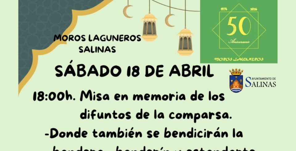 La Comparsa de Moros Laguneros de Salinas celebra este sábado 18 de abril el inicio de los actos conmemorativos de su medio siglo de historia. Fundada en 1976, la agrupación ha preparado una jornada especial que combina el recogimiento, la música y la fiesta para honrar cinco décadas de tradición festera en el municipio alicantino.