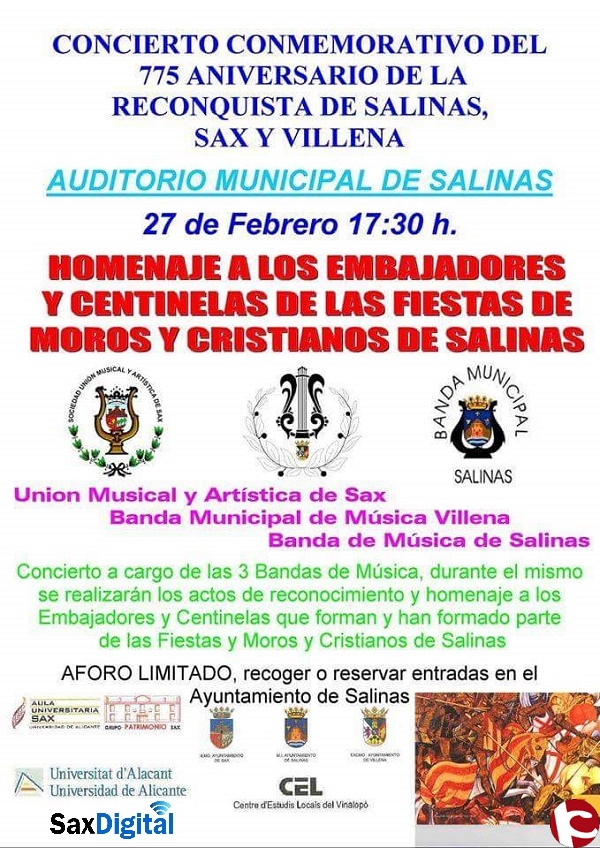 En 2015 se cumplieron 775 años desde que las poblaciones de Villena, Sax, Salinas y Bogarra fueran tomadas por los Caballeros de la Orden de Calatrava en la primavera de 1240, una efeméride que cada una de las poblaciones ha celebrado con diferentes actividades, entre ellas una exposición itinerante. Dentro de estas celebraciones, el municipio de Salinas ha organizado un concierto al que han sido invitadas la Sociedad Unión Musical y Artística de Sax, la Banda Municipal de Música de Villena y la Banda de Música de Salinas, las más antiguas de cada población. El evento tendrá lugar este sábado, 27 de febrero, a las 17.30 h. en el Auditorio Municipal de Salinas.