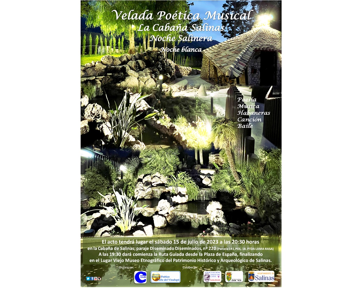 Las Asociaciones Rincón Poético y Cultural Valle del Vinalopó con la colaboración del Ayuntamiento de Salinas y sus Concejalías realizarán un evento Sociocultural Poético Musical con poesía, música, canción, habaneras, rapsoda teatral y baile con noche Salinera al término del recital; una noche blanca con música y tertulia en La Cabaña de Salinas situada en el Paraje Diseminado Diseminados, nº 220 (Parcela 141,POL. 18, PTDA LAMA RASA), junto con las asociaciones locales que colaboran con nosotros en el decorado del evento. Tendremos una ruta guiada de interés turístico y cultural por los lugares más emblemáticos y entrañables del pueblo como son Plaza de España, Arco del Ayuntamiento, Iglesia de San Antonio Abad y Virgen del Rosario su Patrona, parque la Rana, Lugar Viejo Museo del Patrimonio Histórico y Arqueológico…, gracias a las asociaciones de Cultura Lugar Viejo Patrimonio Histórico y Arqueológico y demás asociaciones locales. Al término del recital tendremos el llamado picoteo por gentileza del Ayuntamiento y el aporte de sus asociaciones.