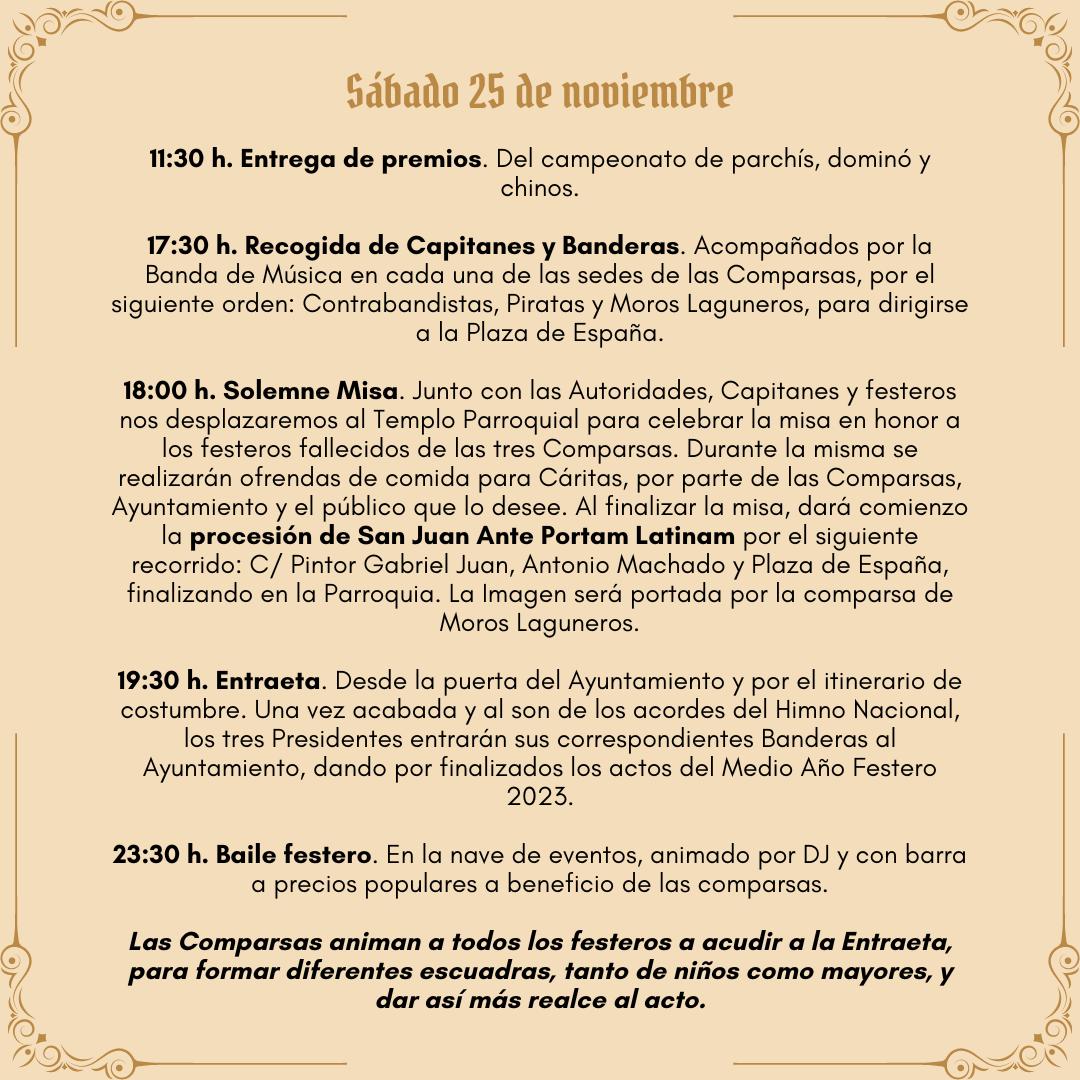 Especialmente se anima por parte de las Comparsas a que todos los festeros acudan a la Entraeta del Sábado 25 para formar diferentes escuadras y otorgar mayor realce a este acto.