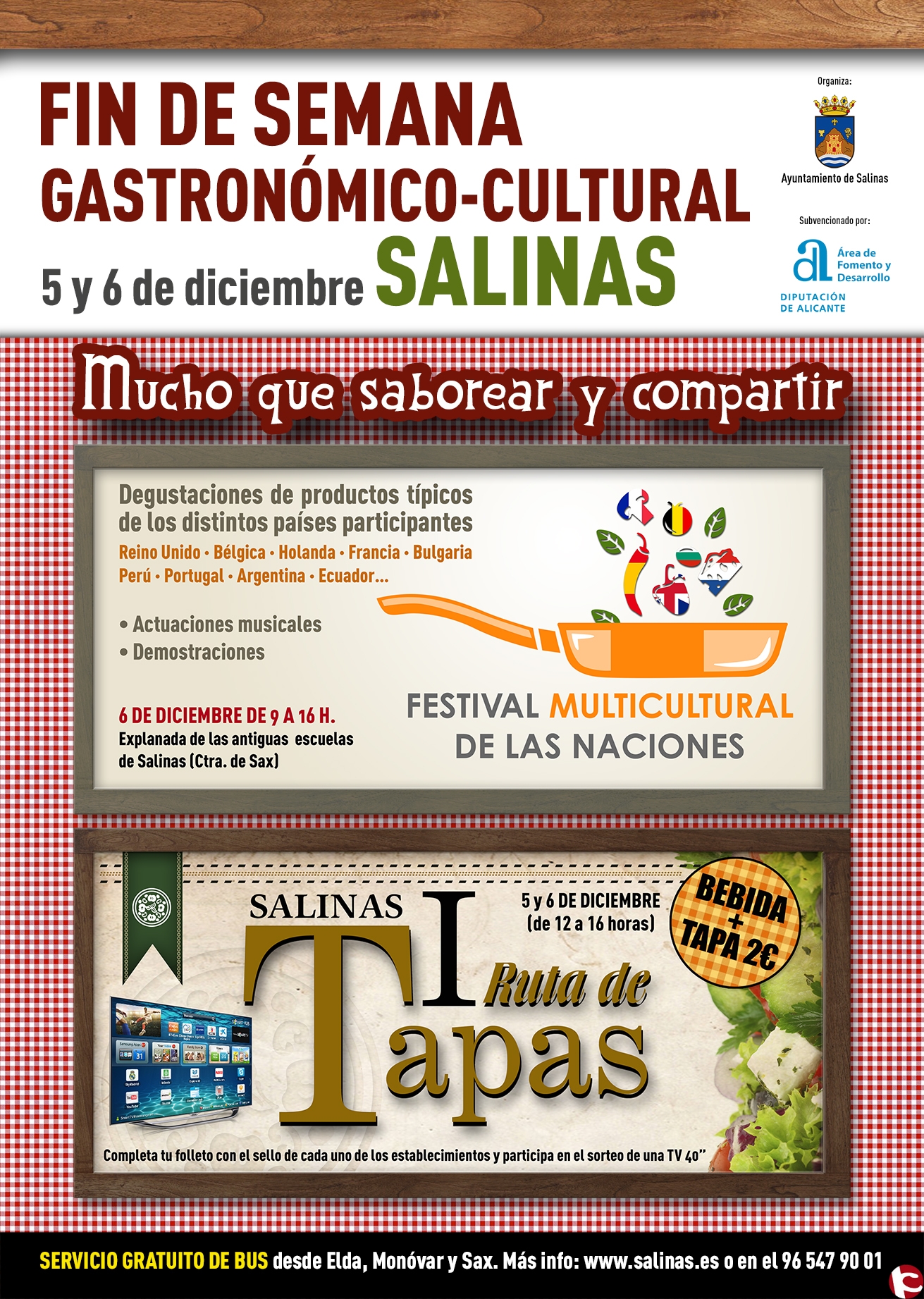 “Queremos que los vecinos de la comarca conozcan de primera mano nuestra gastronomía y nuestro carácter acogedor y hospitalario”, ha señalado Isidro Monzó, Alcalde de Salinas. Por eso, El Ayuntamiento de Salinas, organizador de este fin de semana gastronómico-cultural, ha habilitado un servicio de bus gratuito para los vecinos de las poblaciones cercanas de Elda, Monóvar y Sax que quieran acercarse hasta Salinas. Las personas interesadas pueden encontrar más información e inscribirse a través de la propia página Web del Ayuntamiento: www.salinas.es.