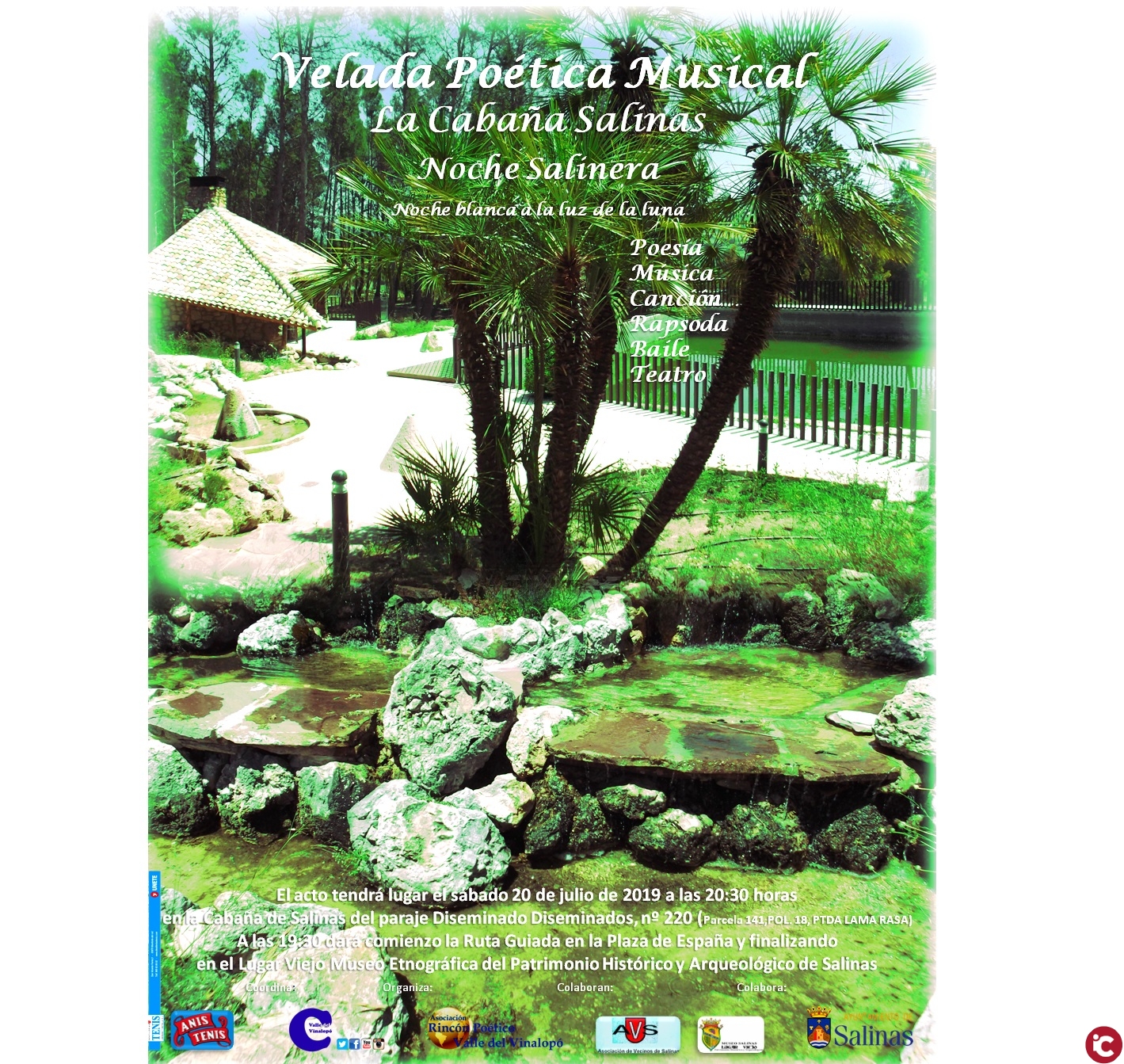 La Asociación Rincón Poético Valle del Vinalopó con la colaboración del Ayuntamiento de Salinas y sus Concejalías realizará un evento Sociocultural Poético Musical con poesía, música, rapsoda teatral, baile, teatro y noche Salinera al termino del recital; una noche blanca a la luz de la luna con música y tertulia en la Cabaña de Salinas situada en el Paraje Diseminado Diseminados, nº 220 (Parcela 141,POL. 18, PTDA LAMA RASA), junto con las asociaciones locales que colaboran en el decorado del evento y Ruta Guiada de interés Turístico y Cultural por los lugares más emblemáticos y entrañables del pueblo; como son Plaza de España, Arco del Ayuntamiento, Iglesia de San Antonio Abad y Virgen del Rosario su Patrona, Parque La Rana, Lugar Viejo Museo del Patrimonio Histórico y Arqueológico ; entre ellas la Asociación de Cultura Lugar Viejo Patrimonio Histórico y Arqueológico y Asociación de Vecinos de Salinas. Al término del recital tendremos el llamado picoteo por gentileza del Ayuntamiento y el aporte de sus asociaciones con un vino de Vinos de Alicante, también podremos degustar las bebidas espirituosas de Anís Tenis.