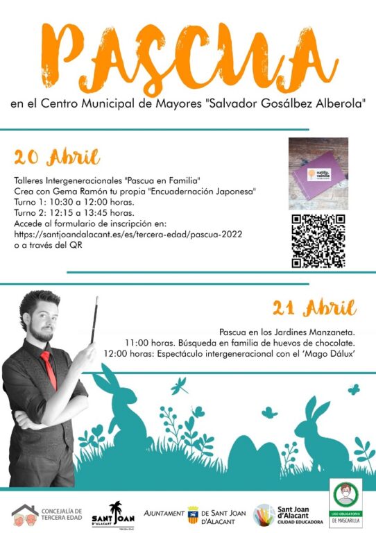La concejalía de Tercera Edad dirigida por Esther Donate, celebrará un año más la PASCUA en el Centro Municipal de Mayores “Salvador Gosálbez Alberola”. Ven a celebrarla junto a tus hijas e hijos, nietas y nietos, abuelas y abuelos y disfruta en familia.