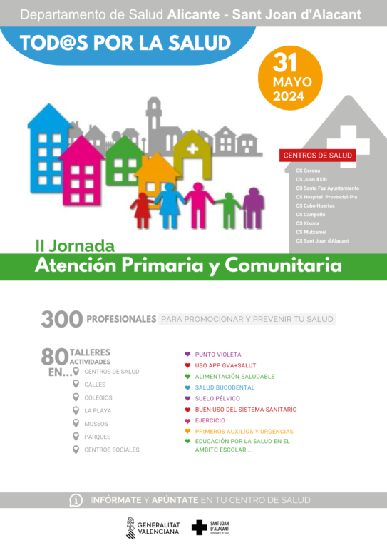 El departamento de salud Alicante-Sant Joan d’Alacant celebra el viernes 31 de mayo una gran fiesta de salud en comunidad en su II Jornada de Atención Primaria y Comunitaria que lleva como lema ‘Tod@s por la salud’. En total se han programado 80 talleres y actividades con la participación de 300 profesionales de sus nueve zonas básicas, que incluyen los centros de salud Gerona, Juan XXIII, Santa Faz Ayuntamiento, Hospital Provincial-Pla, Cabo Huertas, Campello, Xixona Mutxamel y Sant Joan d’Alacant y sus once consultorios auxiliares.