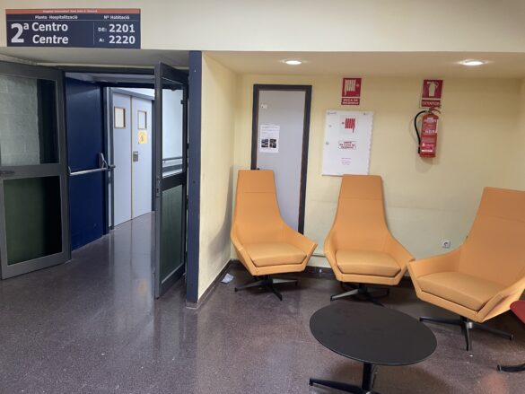 A la entrada de la zona de hospitalización de cada planta se han colocado tres sillones ergonómicos y dos mesitas. También se ha instalado el nuevo mobiliario en la planta baja del hospital, tanto en la zona del laboratorio de extracciones como en el lucernario. Los sillones son de respaldo alto y están diseñados para sujetar la zona lumbar y cervical. Además, disponen de un sistema de autogiro que los devuelve a su posición inicial cuando la persona que está sentada se levanta. Tienen un tapizado higiénico para facilitar su limpieza.