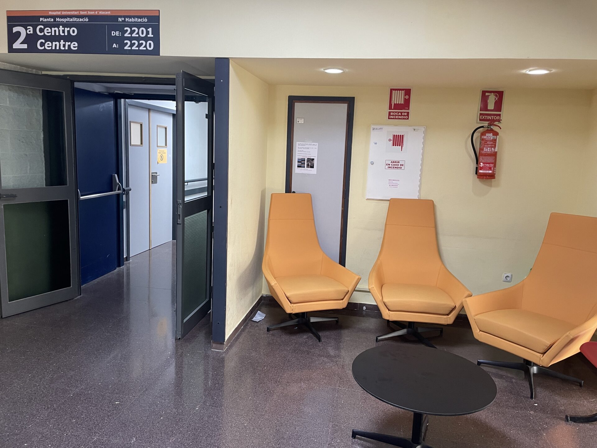 Sant Joan d’Alacant (23.08.23). El Hospital Universitario Sant Joan d’Alacant ha invertido 18.000 euros en la adquisición de nuevo mobiliario destinado a humanizar los espacios comunes de la planta baja y las cuatro plantas de hospitalización del centro. Además de mejorar el confort de los usuarios, los sillones cumplen con una función identificativa de espacios, ya que son de tres colores, los mismos que se emplean para señalizar las zonas norte, centro y sur del edificio.