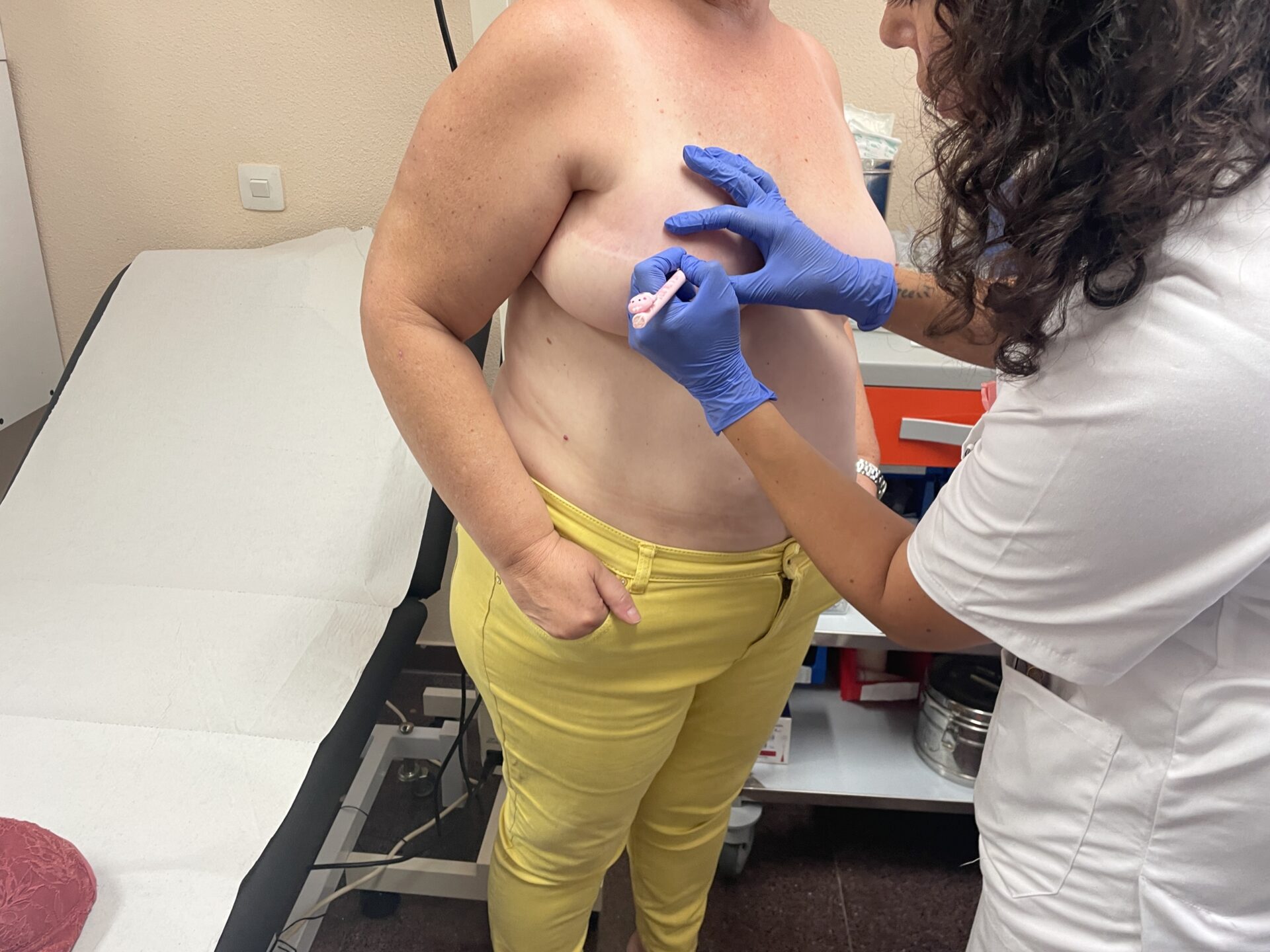“A mí me operaron en 2014 y un año después me realizaron la reconstrucción tras extraerme mi propia grasa corporal, después de tanto tratamiento y de pasar varias veces por quirófano, opté por no operarme más para reconstruir el pezón”, indica la primera paciente de la nueva Consulta de Enfermería de Micropigmentación Mamaria, que se realiza cada martes en el Hospital Universitario Sant Joan d’Alacant. “Me he animado a venir porque veo que es algo indoloro y rápido y creo que se obtienen muy buenos resultados, cuando me operaron para mí supuso un gran choque adaptarme a mi nueva imagen,”, añade la mujer.