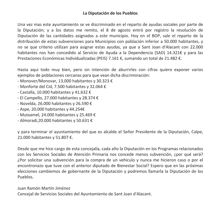 Una vez mas este ayuntamiento se ve discriminado en el reparto de ayudas sociales por parte de la Diputación; y a los datos me remito, el 8 de agosto entró por registro la resolución de Diputación de las cantidades asignadas a este municipio. Hoy en el BOP, sale el reparto de la distribución de estas subvenciones para Municipios con población inferior a 50.000 habitantes, y no se que criterio utilizan para asignar estas ayudas, ya que a Sant Joan d’Alacant con 22.000 habitantes nos han concedido al Servicio de Ayuda a la Dependencia (SAD) 14.321 y para las Prestaciones Económicas Individualizadas (PEIS) 7.161 , sumando un total de 21.482 .