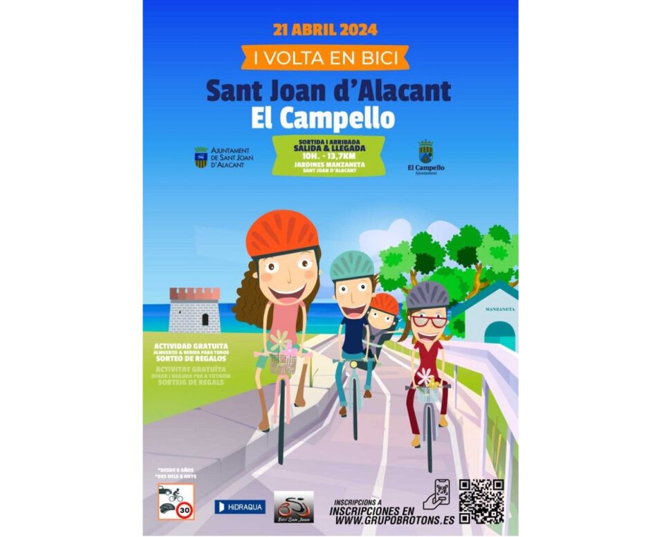 Los interesados ya se pueden inscribir en la web www.grupobrotons.es, y se admitirá participación hasta 30 minutos antes de la salida. Para el próximo 21 de abril, domingo, las concejalías de Medio Ambiente de los ayuntamientos de Sant Joan y El Campello han organizado la “I Volta en bici” entre ambos municipios, una prueba abierta a la participación de toda la familia que contará con avituallamiento, seguro de participante, servicios sanitarios y regalos.