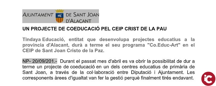 NP- 20/09/201.- Durant el passat mes d’abril es va obrir la possibilitat de dur a terme un projecte de coeducació en un dels centres educatius de primària de Sant Joan, a través de la collaboració entre Diputació i Ajuntament. Les corresponents àrees d’igualtat van fer la gestió perquè finalment tirés endavant.