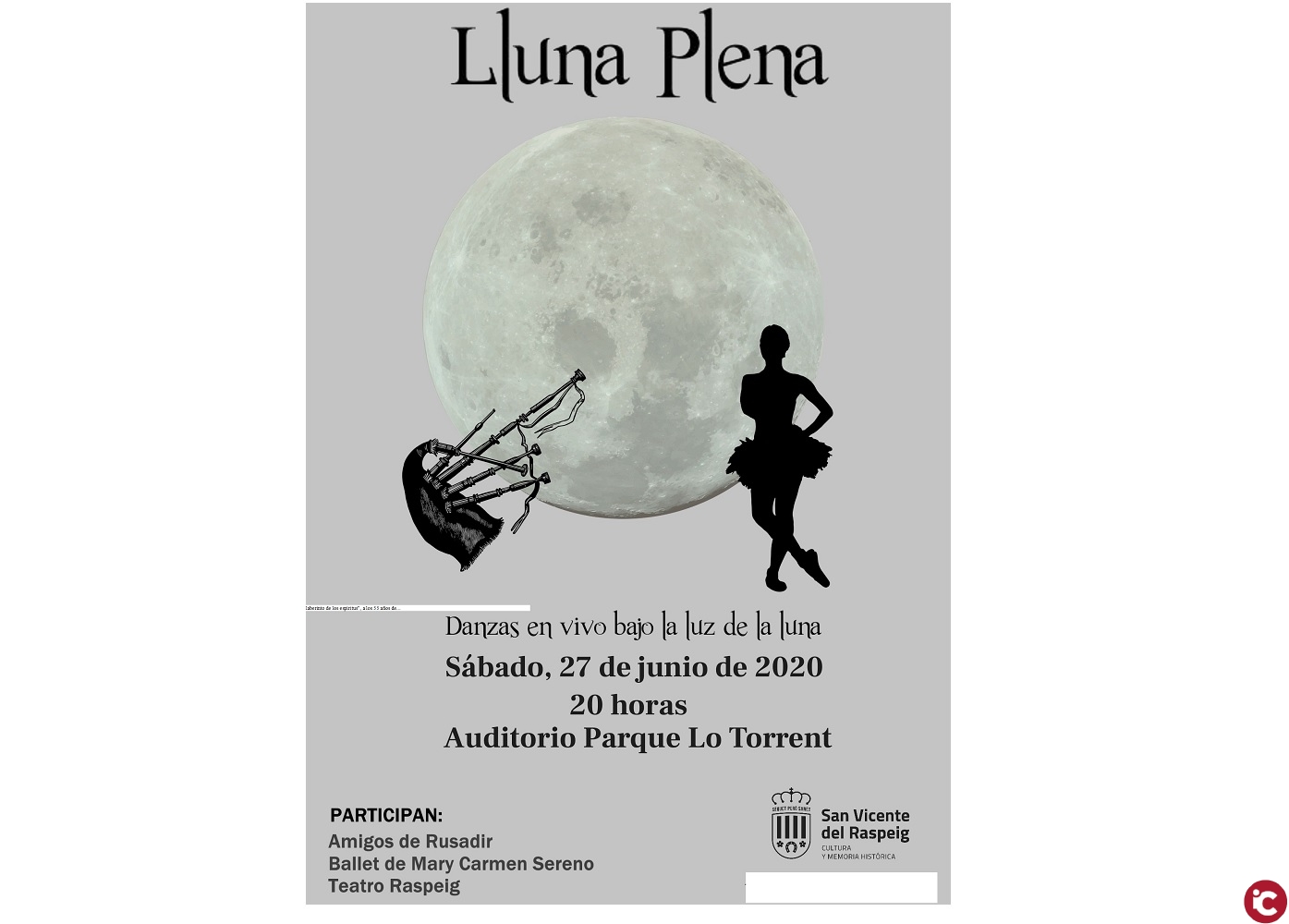 22/06/2020. La Concejalía de Cultura y Memoria Histórica ha programado el espectáculo Lluna Plena el próximo sábado, 27 de junio, en el auditorio del Parque Lo Torrent. El aforo queda limitado a 100 personas como medida preventiva para evitar eventuales contagios de la Covid-19.