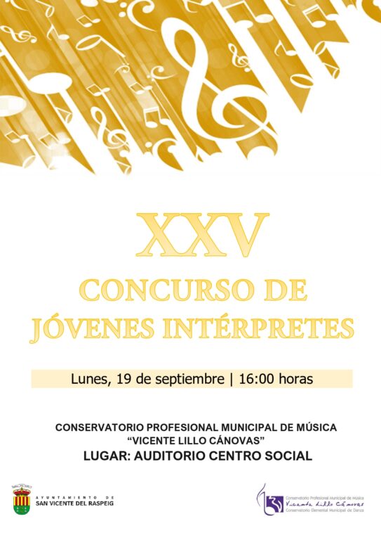 El Auditorio Municipal acogerá el próximo lunes 19 de septiembre la celebración de la XXV edición del Concurso de Jóvenes Intérpretes. En esta emotiva velada, que comenzará a las 16:00h, actuarán 19 alumnos del Conservatorio Profesional de Música “Vicente Lillo Canóvas” en un certamen que tiene como objetivo premiar el talento musical y el esfuerzo de los y las estudiantes durante el curso escolar 2021/2022. Los participantes, de 1º a 4º (nivel A) y de 5º a 6ª (nivel B), concursarán en las modalidades de música de cámara y solista.