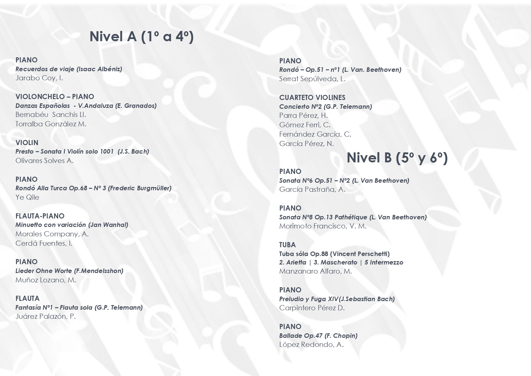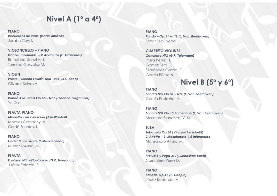 Están previstas 14 audiciones en las que actuarán dos dúos, uno de violonchelo y piano y otro de flauta y piano; un cuarteto de violines; y once solistas que interpretarán sus obras musicales con piano, violín, flauta y tuba. Los alumnos disponían de libertad para elegir la pieza a interpretar, por lo que se trata de un programa variado que recoge autores como Chopin, Albéniz, Granados, Burgmüller, Wanhal, Mendelsshon, Telemann, Perschetti, Bach y Beethoven.