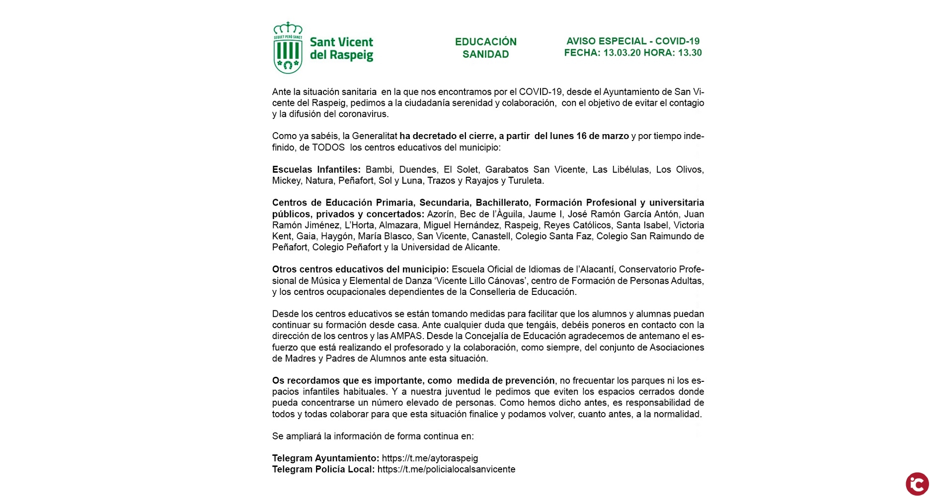 Desde el Ayuntamiento de Sant Vicent del Raspeig se pide a la ciudadanía serenidad y colaboración, con el objetivo de evitar el contagio y la difusión del coronavirus. Asimismo, informan, conforme a la decisión de la Generalitat Valenciana, del cierre de todos los centro educativos desde Infantil hasta FP y Universidad, desde le próximo lunes, 16 de marzo.