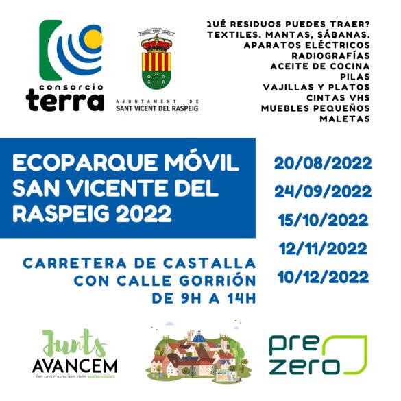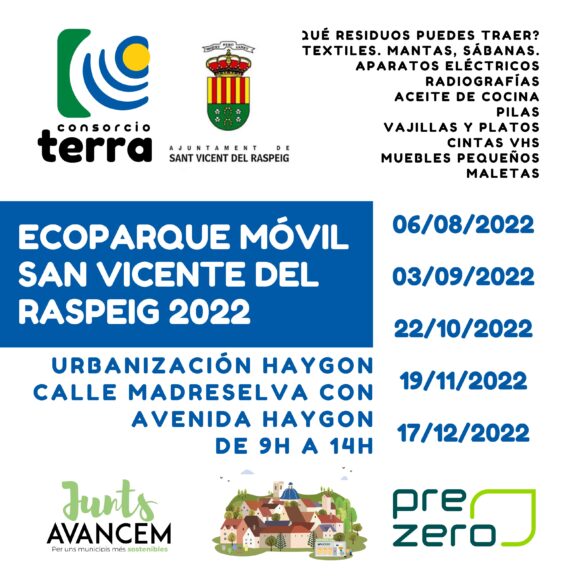 Este servicio en los alrededores del casco urbano de San Vicente del Raspeig estará disponible un sábado al mes en cada ubicación indicada hasta final de año. Independientemente a estas localizaciones, el Ecoparque Móvil también está ubicado todos los martes y jueves de 9h a 14h en el solar de la Inmaculada hasta final de año.