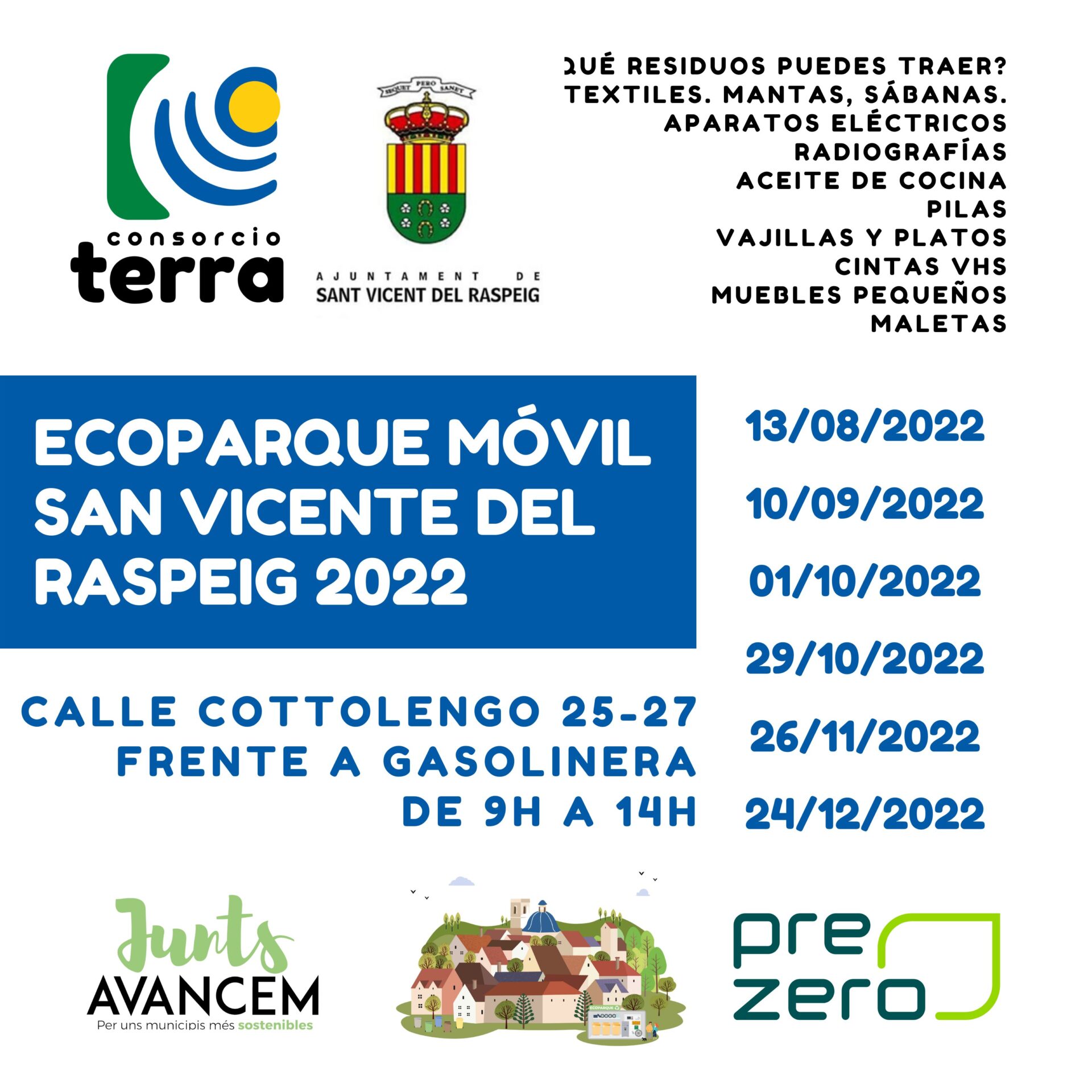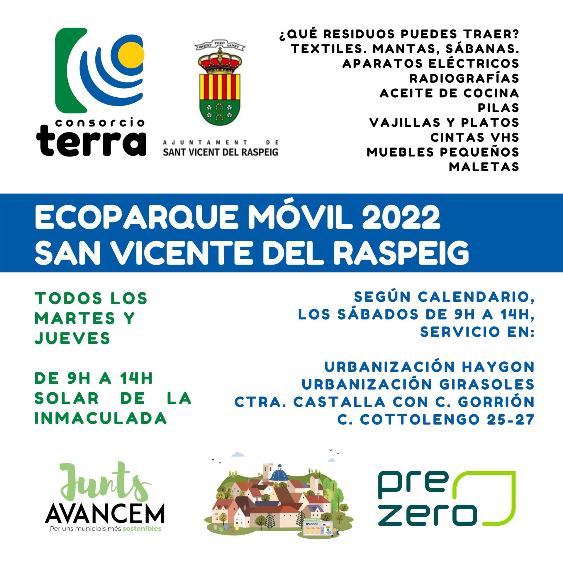 Este servicio en los alrededores del casco urbano de San Vicente del Raspeig estará disponible un sábado al mes en cada ubicación indicada hasta final de año. Independientemente a estas localizaciones, el Ecoparque Móvil también está ubicado todos los martes y jueves de 9h a 14h en el solar de la Inmaculada hasta final de año.