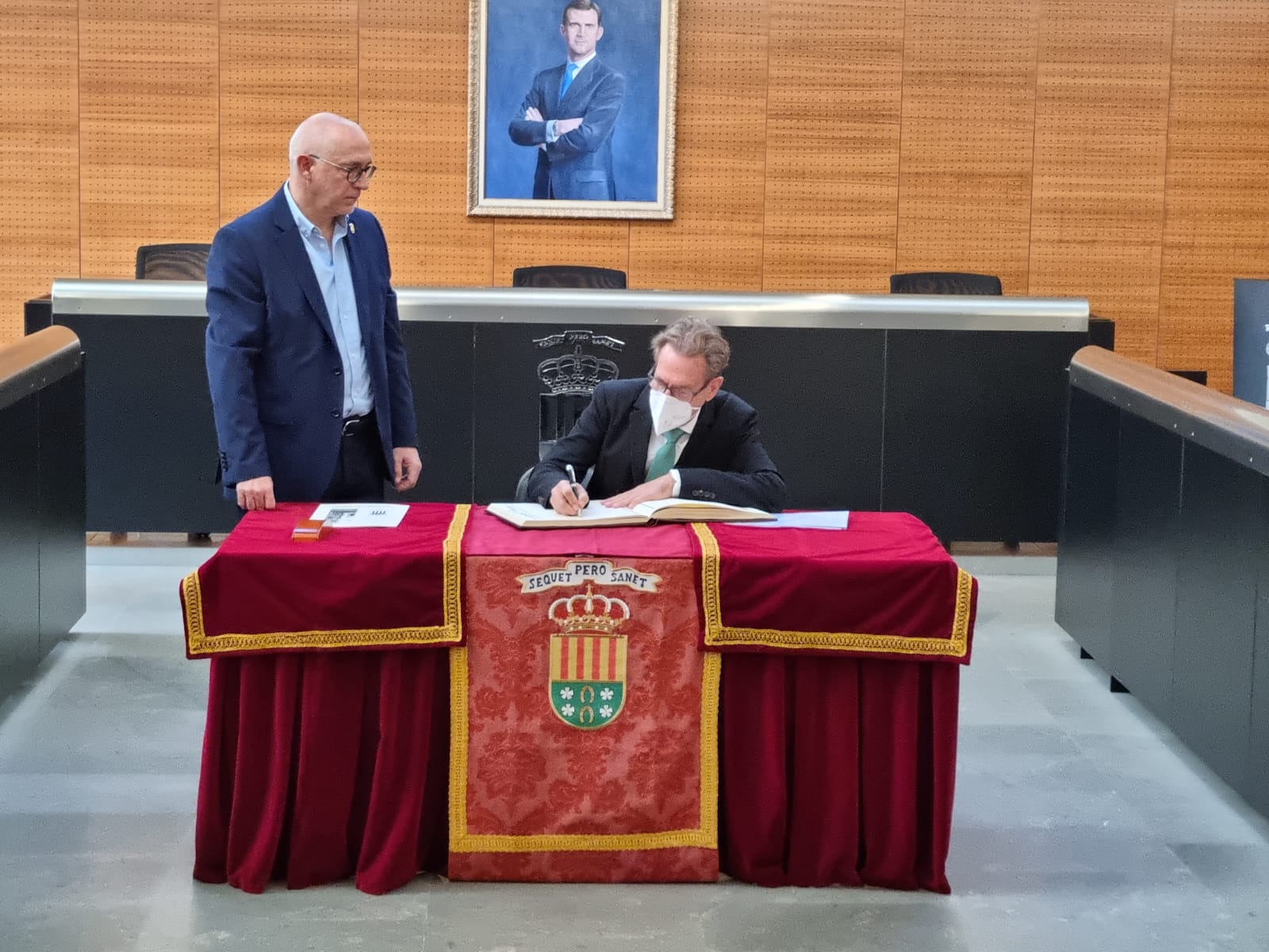 La recepción encabezada por el alcalde, Jesús Villar, ha tenido lugar en el salón plenario, dónde Miguel Mínguez, acompañado de la secretaria autonómica de Eficiencia y Tecnología Sanitaria, Concha Andrés, la directora general de Asistencia Sanitaria, María Amparo García Layunta, y el director general de Alta Tecnología, Inversiones e Infraestructura, Jaime Peris, ha firmado el libro oficial de visitas en presencia de los miembros de la corporación municipal.