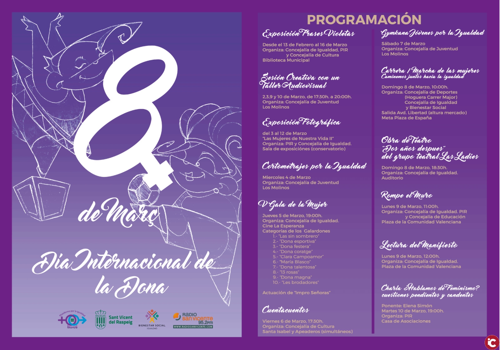 Más de diez actividades gratuitas conforman la programación del 8M elaborada por el consistorio, la Plataforma por la Igualdad Raspeig y los centros educativos. Por fechas, a continuación les detallamos todas las citas.