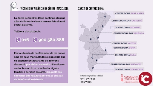 La Delegació del Govern està difonent una Guia per a víctimes de Violència de Gènere- COVID 19. També són nombroses les iniciatives divulgatives empreses des de la Vicepresidència i Conselleria d’Igualtat i Polítiques Inclusives de la Generalitat Valenciana relacionada amb la detecció i intervenció en violència de gènere durant aquest període.