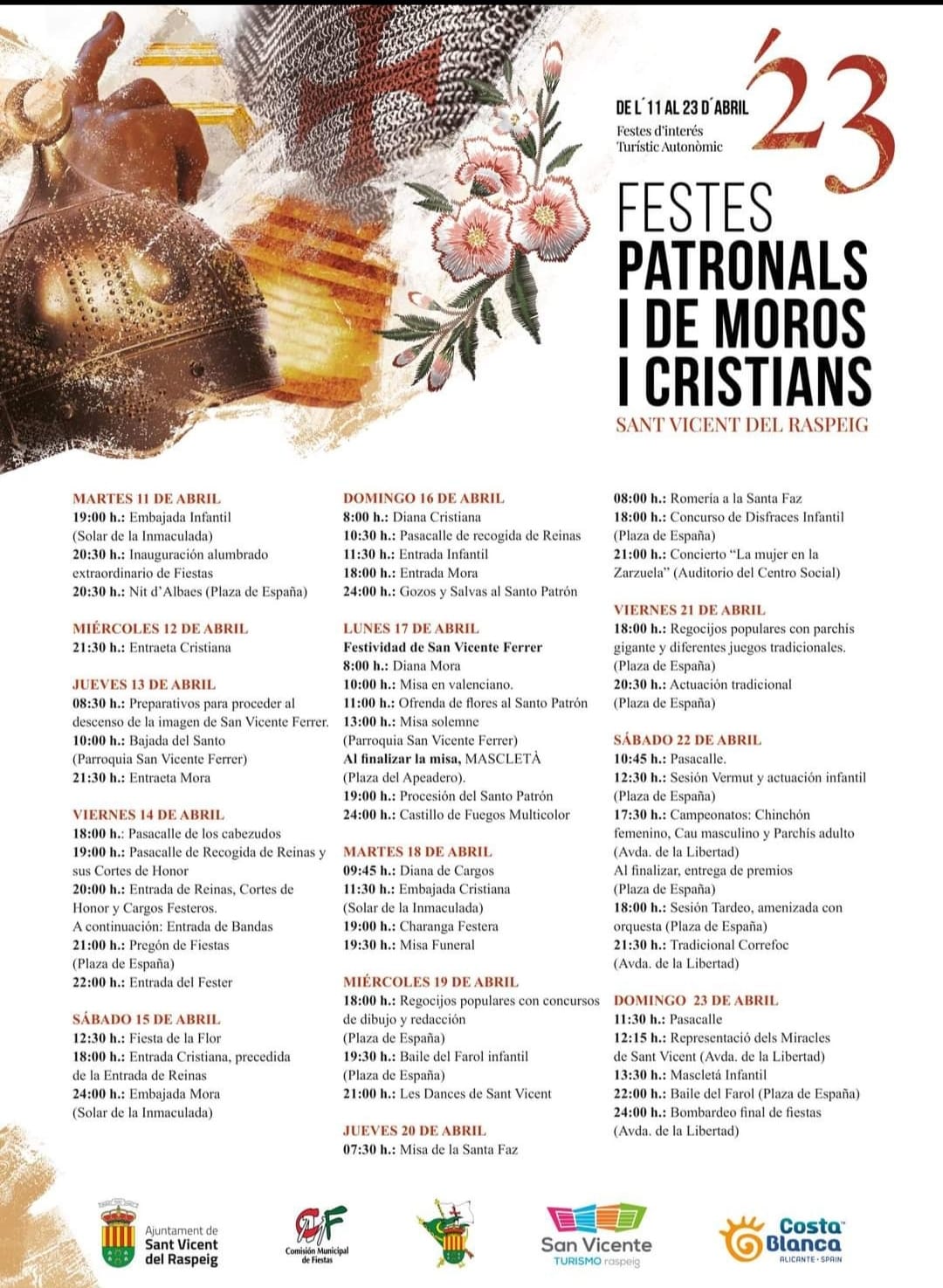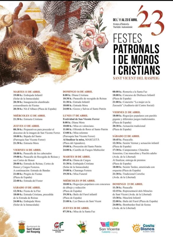 Les ofrecemos el calendario con todos los actos de las Fiestas Patronales y de Moros y Cristianos que se celebran del 11 al 23 de abril de 2023.