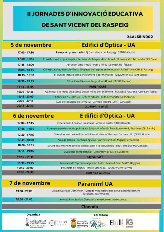 San Vicente del Raspeig, 4 de octubre. El Ayuntamiento de San Vicente del Raspeig iniciará mañana la segunda edición de II Jornadas de Innovación Educativa, un encuentro que acogerá por primera vez la Universidad de Alicante hasta el próximo jueves, 7 de noviembre.