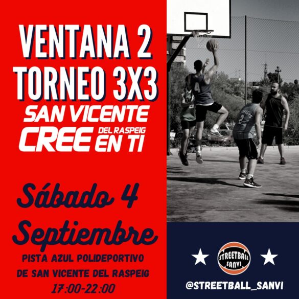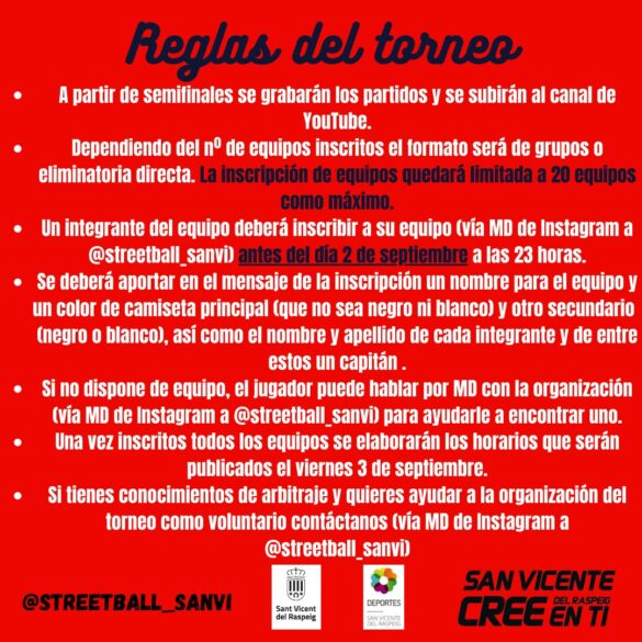 El torneo, que se disputará desde las 17h a las 20h, abre sus inscripciones hasta este próximo jueves 2 de septiembre. Para apuntarse se deberá enviar un mensaje a la cuenta de instagram @streetball_sanvi, con el nombre del equipo y el número de integrantes, compuesto por 3 o 4 personas.