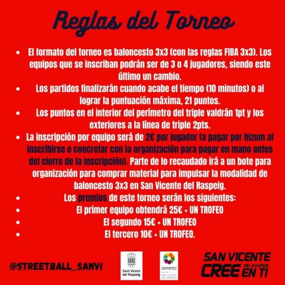 Así mismo, la inscripción cuenta con un coste de 2€ para impulsar la modalidad de 3×3 en la ciudad de San Vicente del Raspeig. Los requisitos completos de inscripción pueden consultarse en el perfil de instagram de @streetball_sanvi o del Ayuntamiento de San Vicente del Rasepig, @aytoraspeig.
