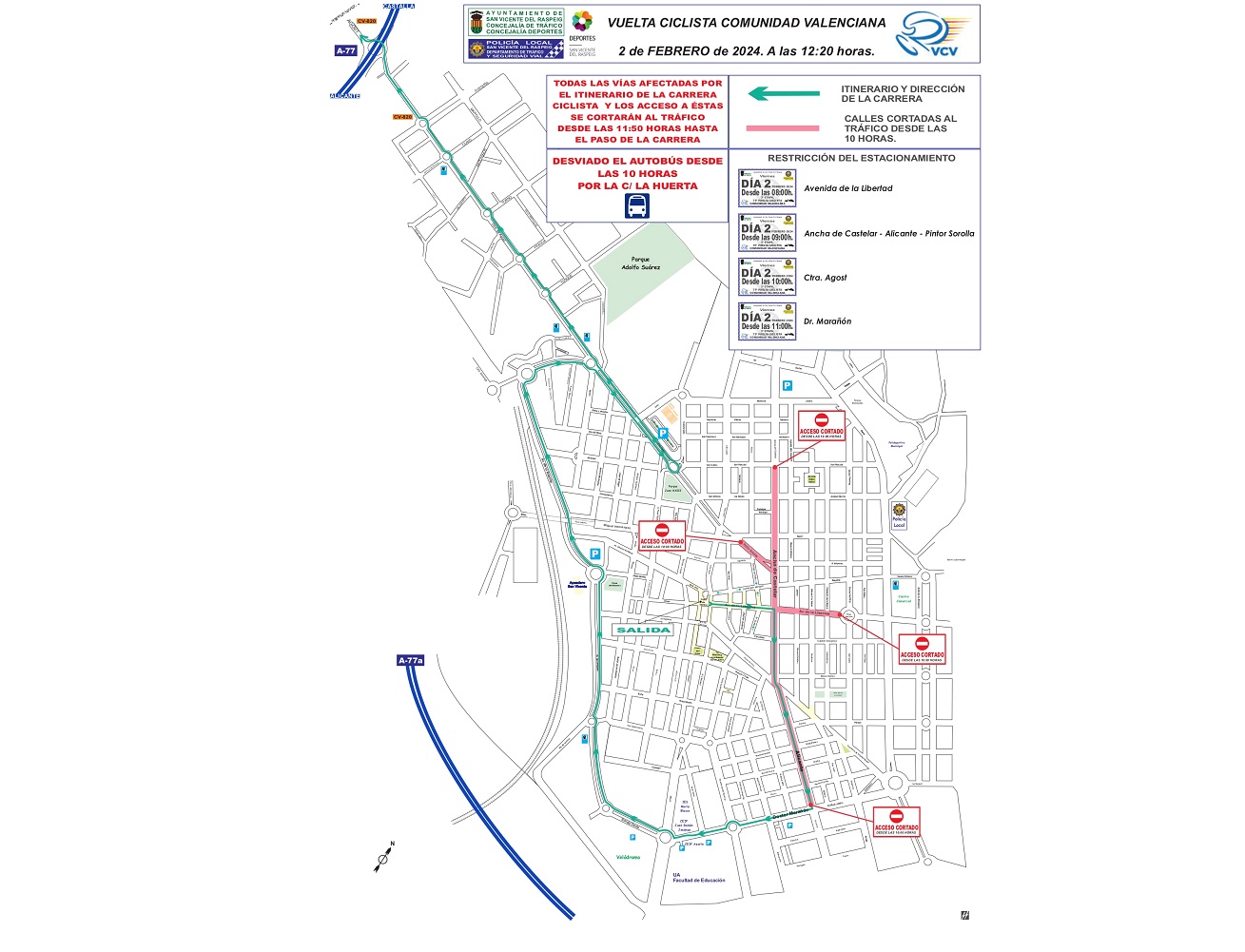 Respecto al recorrido de los autobuses urbanos, se desviarán desde las 10 horas por la calle La Huerta. La restricción del estacionamiento de vehículos comenzará mañana a las 8 horas en la avenida de la Libertad, a las 9 horas en Ancha de Castellar, Alicante y Pintor Sorolla, a las 10 horas en la carretera de Agost y desde las 11 horas en doctor Marañón.