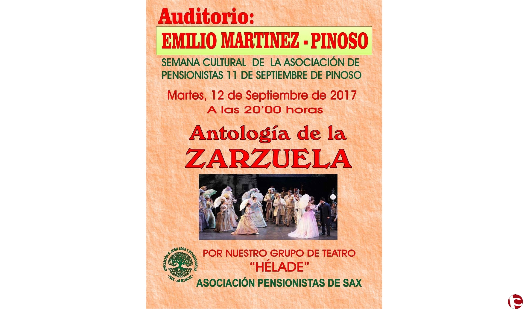 El próximo 12 de septiembre a las 20:00 se acercarán hasta el Audiotorio Emilio Martínez de Pinoso en la semana cultural de la Asociación de pensionistas de dicha población con su Antología de la Zarzuela.