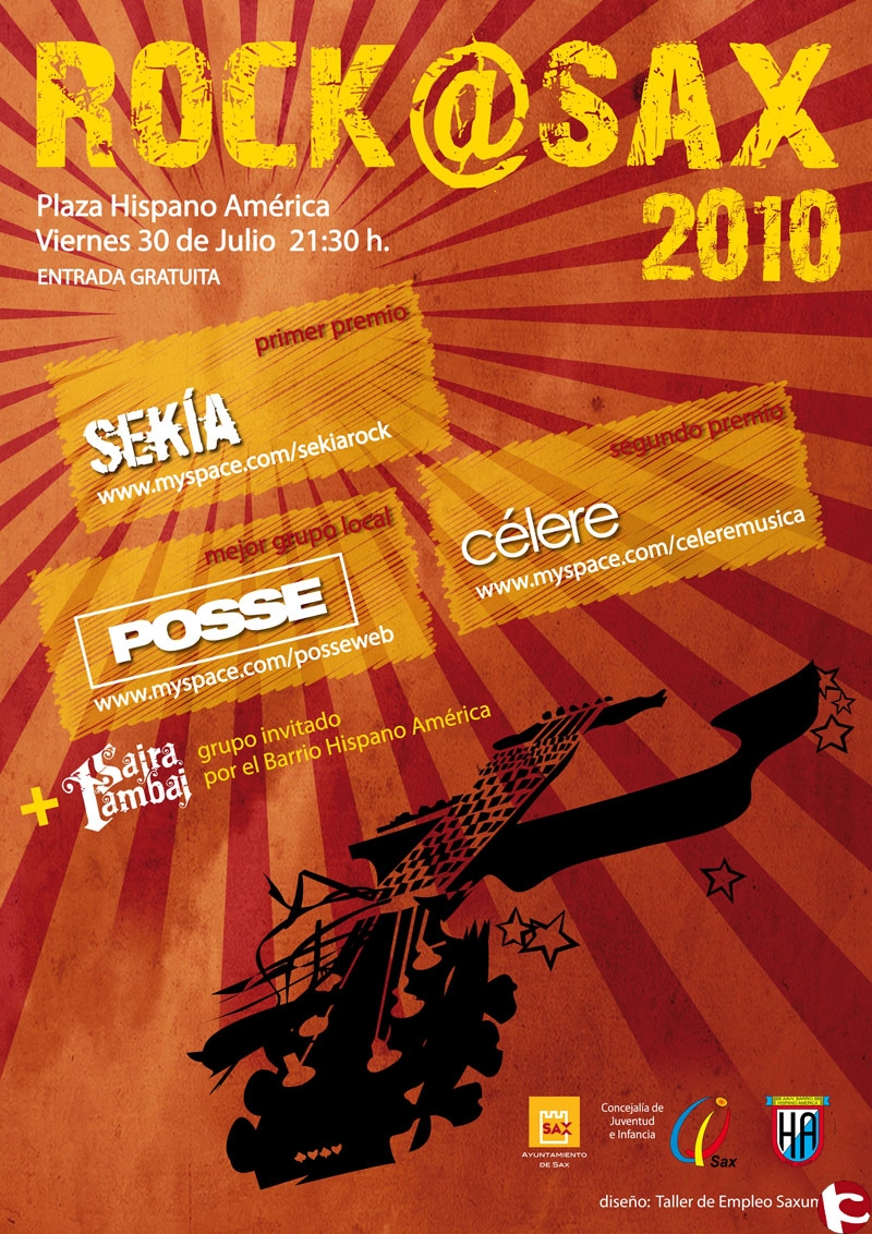 Tanto el certamen como el festival Rock@Sax se enmarcan dentro de la programación que la Concejalía de Juventud e Infancia organiza a lo largo del año y que cuenta con las aportaciones que los jóvenes de Sax realizan a través del Centro de Información Juvenil (CIJ) y a través de sus representantes en diferentes asociaciones con el objetivo de enriquecer la oferta cultural y de ocio del municipio. Los conciertos tendrán lugar el próximo viernes, 30 de julio, en la Plaza Hispano América, a partir de las 21.30 horas, con entrada gratuita. Más información en la página web www.myspace.com/rockasax.