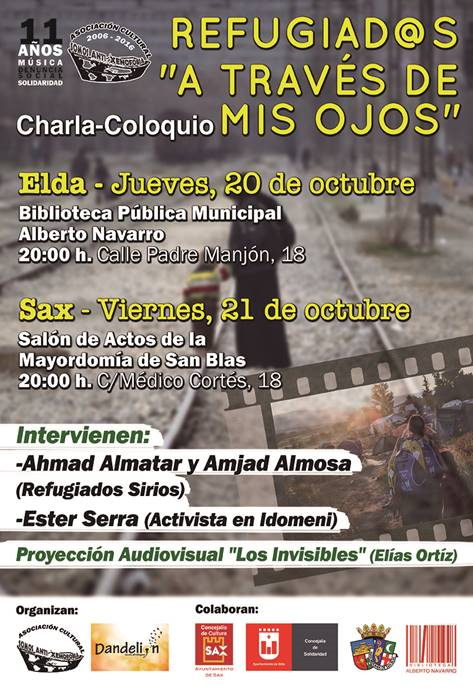 La Asociación Cultural Somos Anti Xenofobia de Sax, presenta en la comarca unas jornadas para conocer un poco más la realidad de los refugiados, con la colaboración de las concejalías de Cultura de Sax y Concejalía de Solidaridad de Elda, y la participación de la ONG Dandelión. El próximo jueves 20 de Octubre en Elda (Biblioteca de Padre Manjón), y el viernes 21 de Octubre en Sax llegará la Charla Coloquio «Refugiad@s, a través de mis ojos». Interesantísma oportunidad de escuchar en primera persona el testimonio de dos refugidos sirios, Ahmad Almatar y Amjad Almosa y además la intervención de Ester Serra, activista y voluntaria en los campamentos de Idomeni. También en dicho acto se visionará una videoproyección titulada «Los Invisibles», del creador argentino Elías Ortíz…