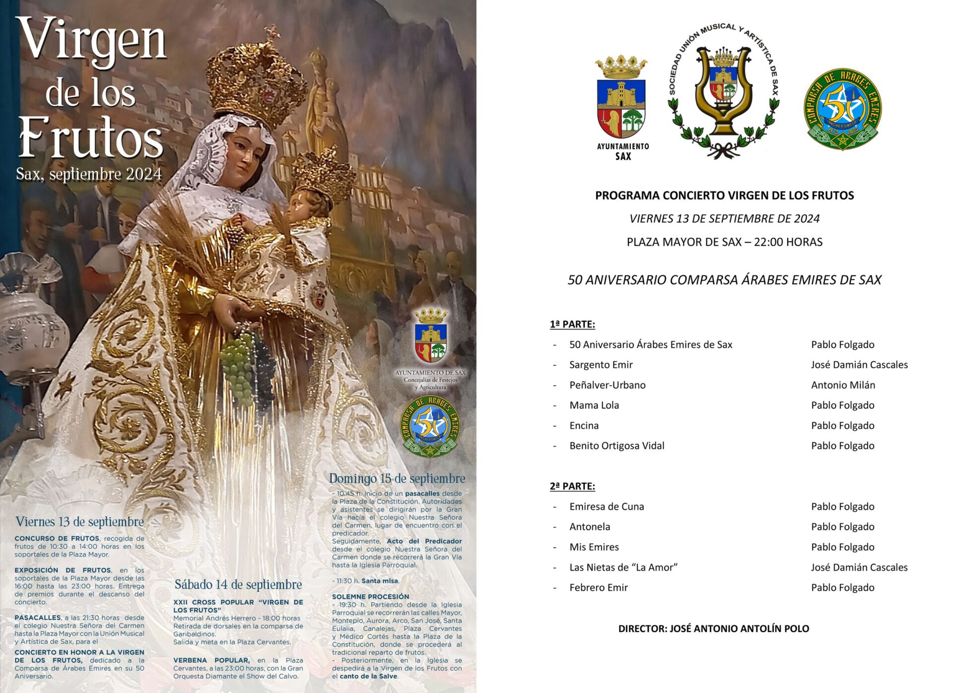 Para la primera parte, el director de la banda, José Antonio Antolín Polo, ha preparado el siguiente repertorio: «50 Aniversario Árabes Emires de Sax», «Sargento Emir», «Peñalver-Urbano», «Mama Lola», «Encina» y «Benito Ortigosa Vidal»