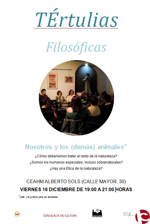 Continuamos con las tertulias filosóficas que se iniciaron hace un mes con tan buena acogida. En esta ocasión debatiremos de "Nosotros y los (otros) animales". Recordad que es algo para todos los públicos y que no se requiere ningún conocimiento previo de