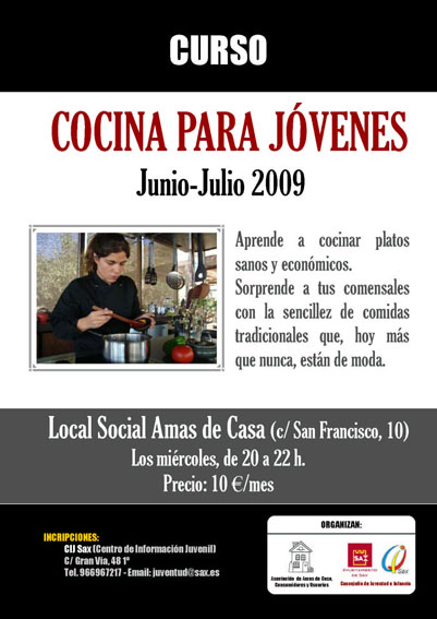 La Concejalía de Juventud e Infancia, con la colaboración de la Asociación de Amas de Casa, Consumidores y Usuarios de Sax, ha organizado, para los próximos meses de junio y julio un curso de Cocina para Jóvenes, para que estos aprenden a cocinar platos sanos y económicos, con la sencillez de comidas tradicionales. El curso, que se iniciará el próximo 3 de junio, tendrá lugar todos los miércoles, de 20 a 22 horas, en el local social de la Asociación de Amas de Casa (C/ San Francisco, 10). El precio es de 10 euros mensuales, y el plazo de inscripción ya está abierto. Más información e inscripciones en el CIJ: 96.696.72.17 o juventud@sax.es
