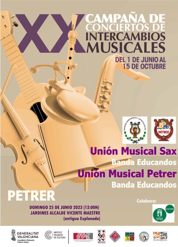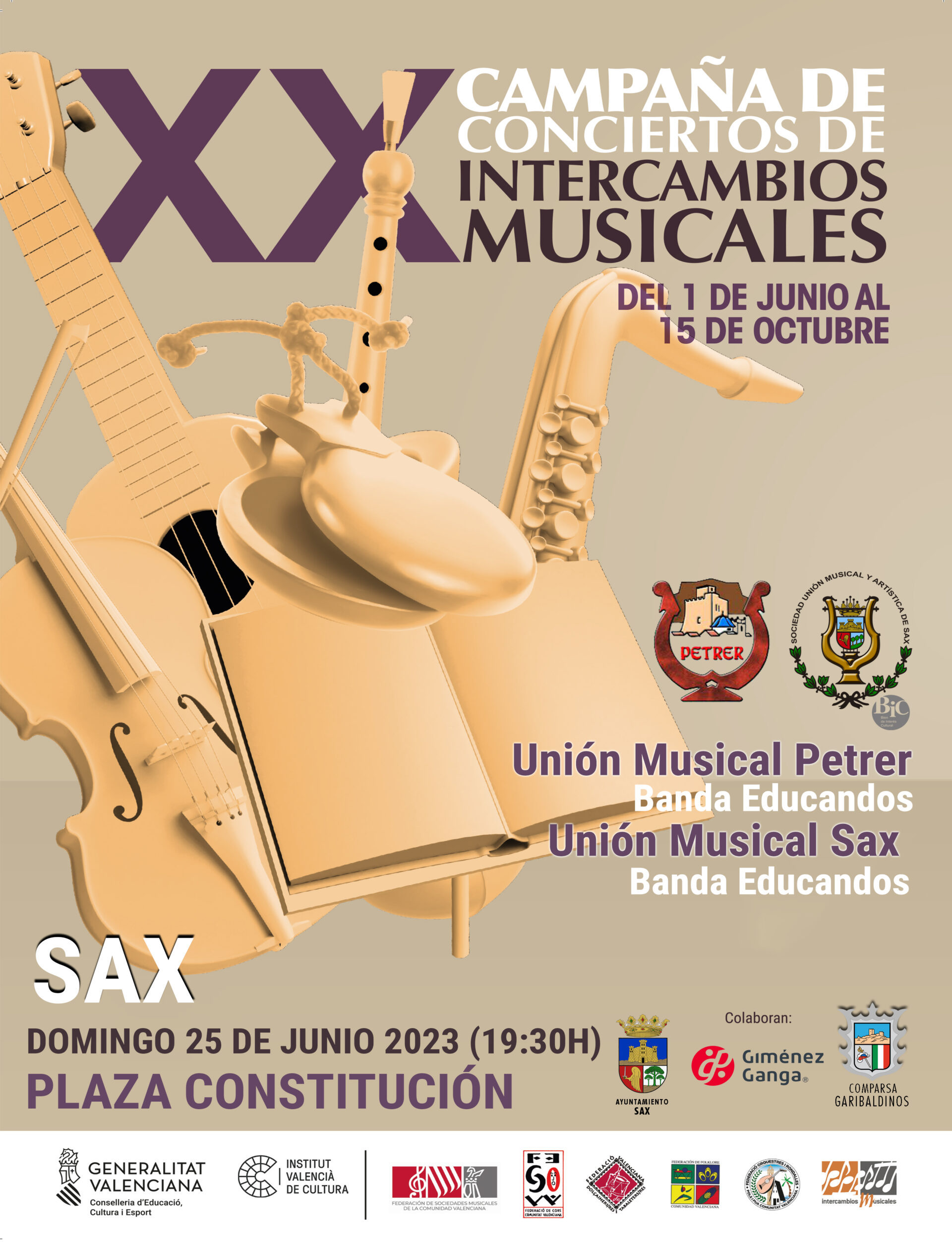 El festival de bandas organizado con motivo de la finalización del presente curso escolar tendrá lugar el próximo domingo 25 de junio a las 19:30h en la Plaza de la Constitución de Sax y está enmarcado dentro de la XX Campaña de Intercambios Musicales de la FSMCV.