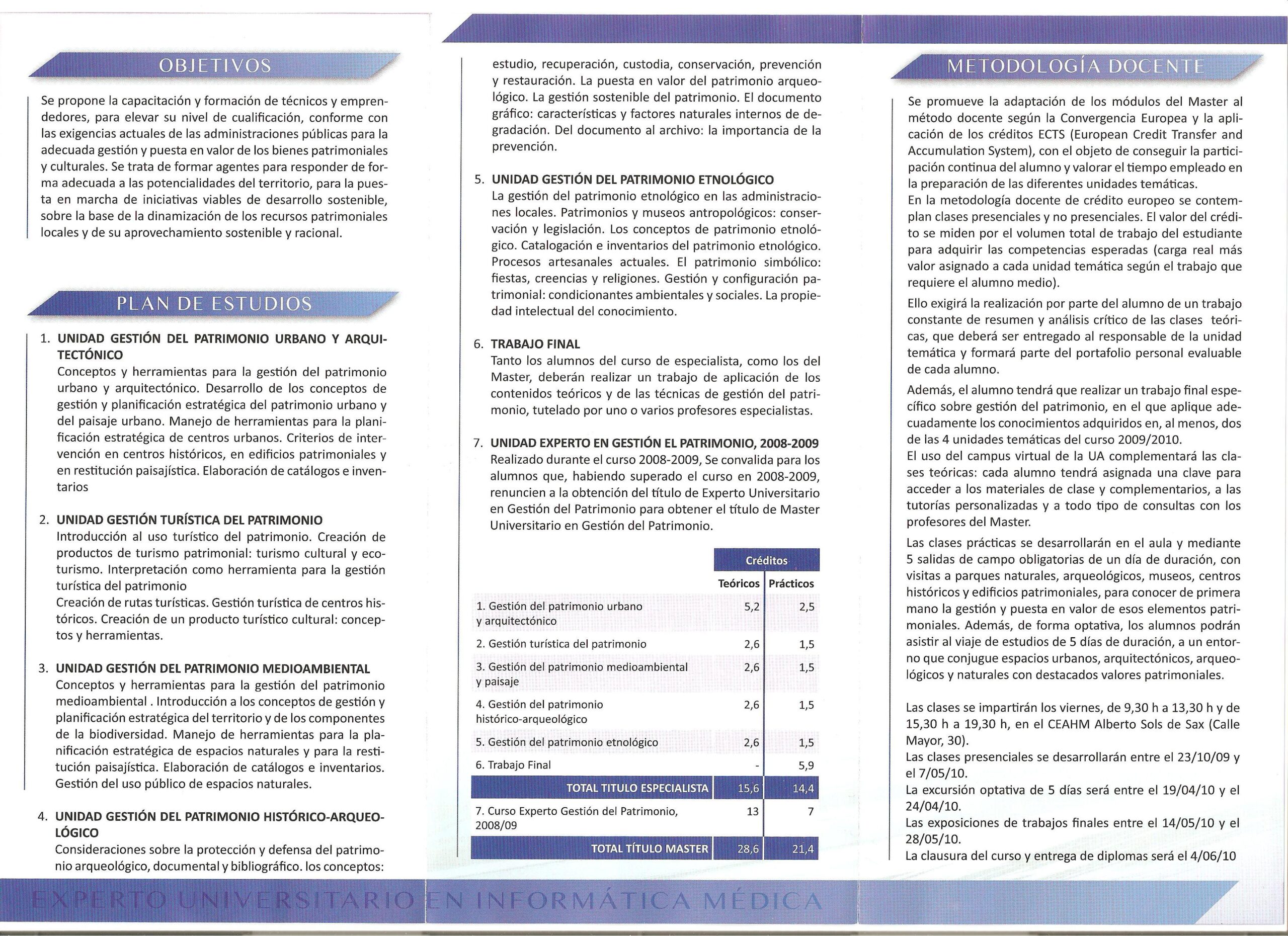 Fue en octubre de 2008 cuando el rector de la Universidad de Alicante, Ignacio Jiménez Raneda, y la alcaldesa de Sax, Ana Barceló, firmaron el convenio de creación del Aula de Extensión Universitaria de la Universidad de Alicante en Sax. De esta manera, el CEAHM Alberto Sols inauguró este nuevo espacio con el Máster en Gestión del Patrimonio, cuya segunda edición comienza el próximo viernes, 23 de octubre, a las 15.00 horas. Al igual que en su primera edición, este curso está dirigido por los profesores Mauro Hernández y Gabino Ponce. Según este último, “la sociedad postindustrial se ha percatado de que existe una parte del patrimonio industrial que ha permanecido abandonado. Se trata de bienes muebles, inmuebles, conjuntos patrimoniales, parajes naturales o modificados por la mano del hombre, etc. Este máster trata de dar un repaso a todos esos recursos para analizar el aprovechamiento sostenible que se puede hacer de ellos”. Estos estudios persiguen el doble objetivo de capacitación profesional, pero también un intento de catalogar, mantener y rescatar ese patrimonio existente en nuestros municipios. El programa se desarrollará a lo largo de todo el curso académico y la parte final del mismo se centrará en los métodos de intervención sobre un espacio o recurso concreto elegido por el propio alumno. Las Aulas de Extensión Universitaria nacen con el objetivo de fomentar la cooperación mutua y favorecer la vinculación entre la Universidad y los distintos municipios de la provincia. Se trata de dar un paso más en el tradicional concepto de extensión universitaria, cuya acción y actividades están dirigidas a todos los miembros de la comunidad universitaria y a la sociedad en general, “con el fin de contribuir a la difusión del conocimiento y la cultura, la igualdad entre hombres y mujeres, la promoción del deporte, la mejora de la calidad de vida y la protección del medio ambiente, como presupuestos del progreso social”, según se recoge en el convenio firmado, y “prestarán especial atención a las demandas sociales de su entorno, así como a la formación de los mayores”. Las clases tendrán lugar en el CEAHM Alberto Sols todos los viernes desde octubre hasta mayo, de 9.30 a 13.30 y de 15.30 a 19.30 horas. La asistencia es gratuita como oyente para el público en general y existe la posibilidad de recibir una media beca de matrícula para los universitarios sajeños que deseen obtener esta titulación. El plazo de inscripción finaliza el 15 de noviembre (Departamento de Geografía Humana de la Universidad de Alicante dghum@ua.es). Más información en el teléfono 96.590.34.20. Plazas limitadas a 40 alumnos.