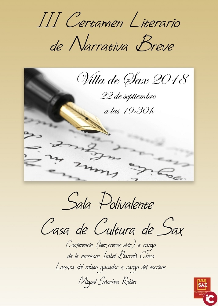 La entrega del premio de este Certamen, del que cabe destacar no sólo la alta participación sino la calidad de muchas de las obras presentadas, se llevará a cabo el próximo 22 de septiembre a las 20 h., en la Sala Polivalente de la Casa de Cultura de Sax. Al acto asistirá el autor de la narración, que leerá la obra ante el público asistente y nos hablará de las motivaciones que le llevaron a escribirla.