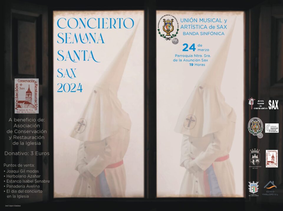 La Unión Musical y Artística de Sax celebrará el próximo domingo 24 de marzo el habitual concierto de Semana Santa, que tendrá lugar a las 19:00h en la Iglesia Nuestra Señora de la Asunción de Sax.
