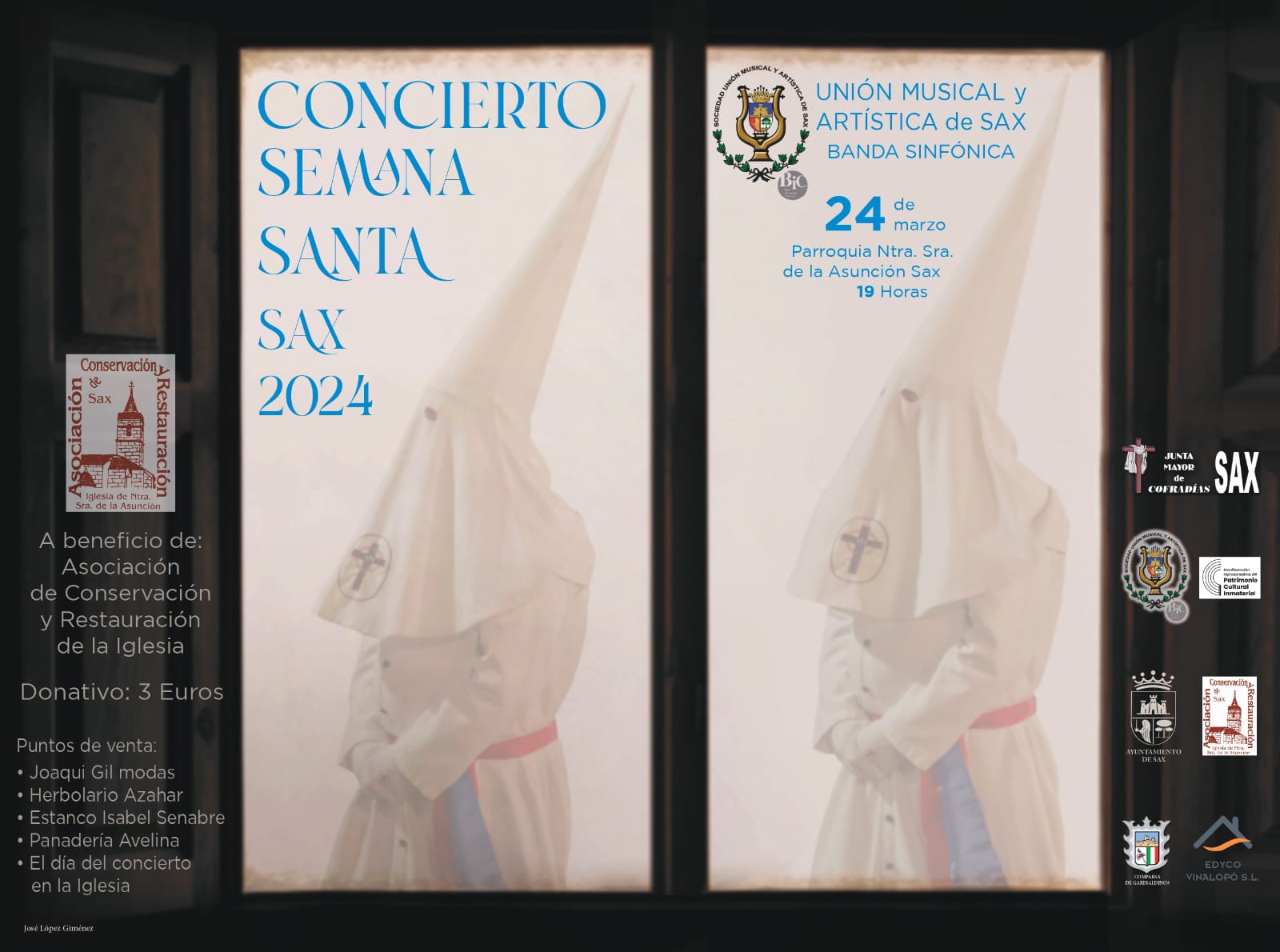 El concierto será en beneficio de la Asociación de Conservación y Restauración de la Iglesia. Asimismo, la entrada supondrá un donativo de 3 euros y se podrá adquirir en los siguientes puntos de venta: Joaqui Gil modas, Herbolario Azahar, Estanco Isabel Senabre, Panadería Avelina y en la puerta de la iglesia el día del evento.