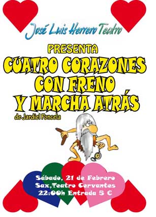 «Cuatro corazones con freno y marcha» se representará en el Teatro Municipal Cervantes el próximo sábado, 21 de febrero, a las 22:00 horas. Entradas a la venta en taquilla (5 euros), a beneficio del grupo de teatro.