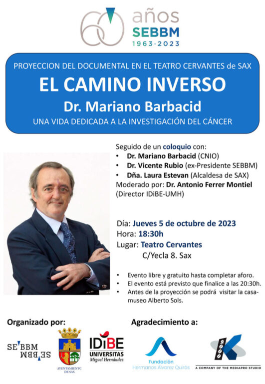 La Sociedad Española de Bioquímica y Biología Molecular (SEBBM) organiza, dentro de sus actividades para conmemorar el 60 aniversario, la proyección del documental “El camino inverso. Dr. Mariano Barbacid” el próximo jueves, a las seis y media de la tarde, que será seguido de un interesante coloquio en el que participará el propio científico español.