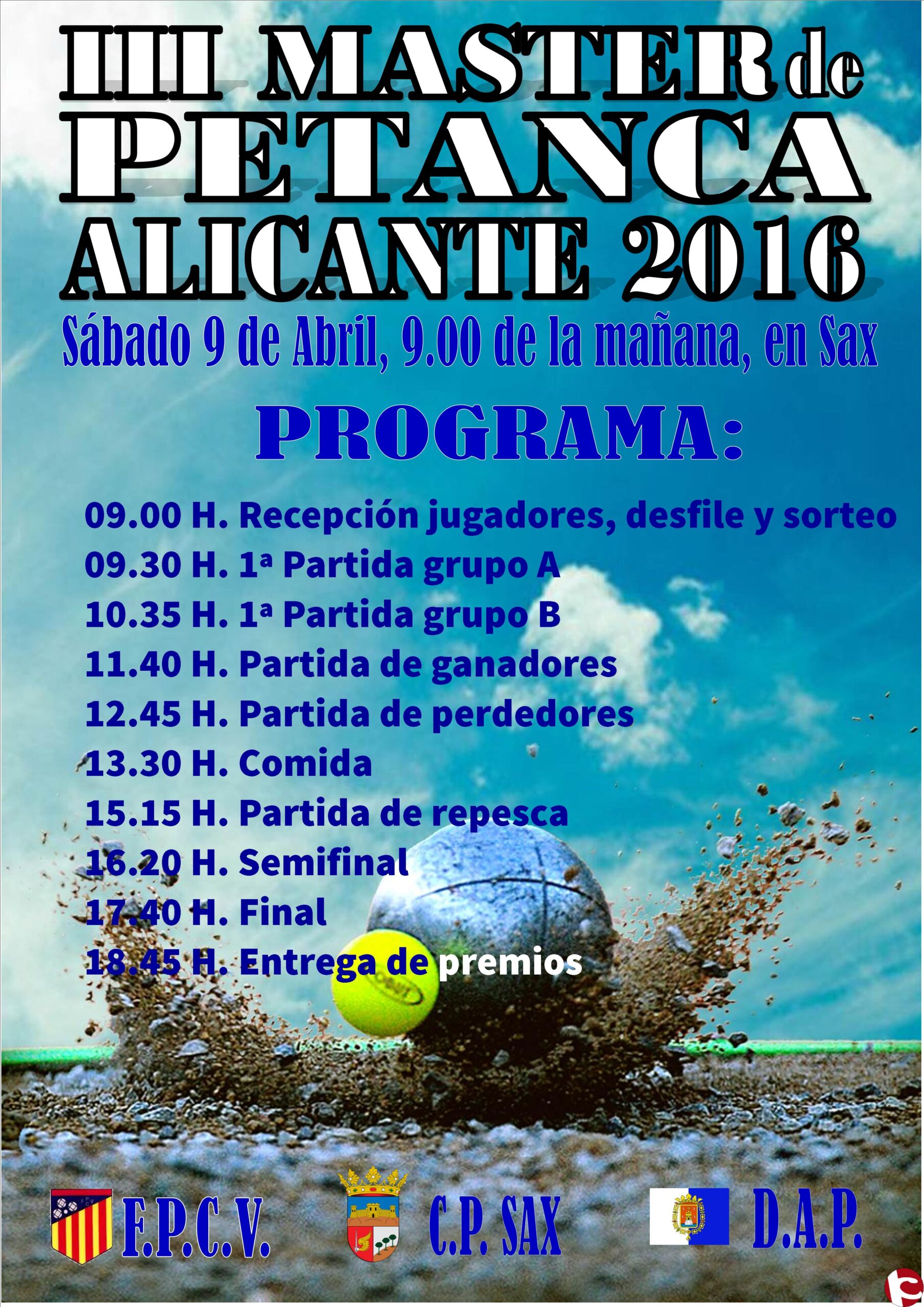 Ddesde el Club Petanca Sax nos informan de que el próximo día 9 de abril, sábado, el Club Petanca Sax será la sede del III Master Provincial Masculino de Petanca.