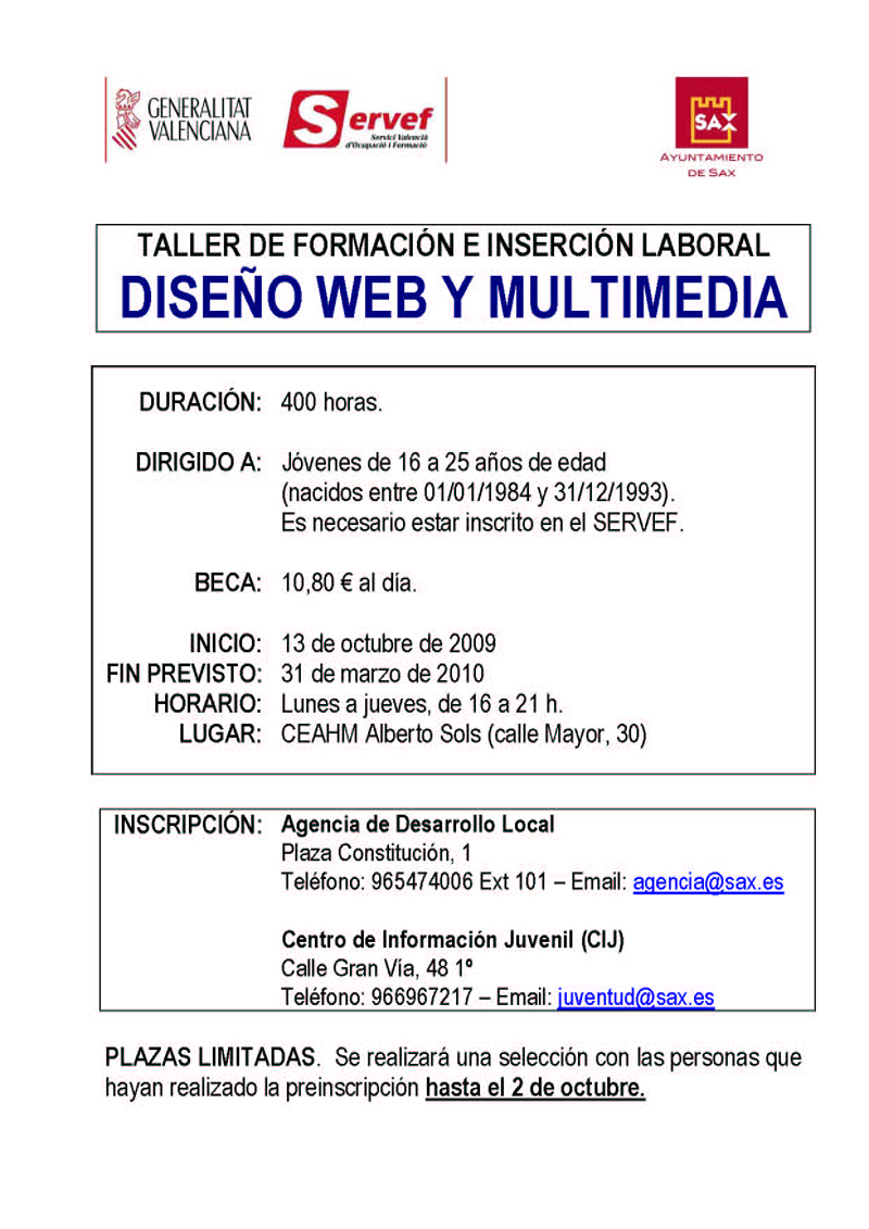 El Taller de Formación e Inserción Laboral en diseño web y multimedia da comienzo hoy, en las aulas del CEAHM Alberto Sols, a iniciativa de las Concejalías de Juventud e Infancia y de Desarrollo Económico del Ayuntamiento de Sax, a través de la Conselleria de Economía, Hacienda y Empleo. Con un total de 10 alumnos y una duración de 400 horas, el objetivo de este taller, destinado a jóvenes desempleados de entre 16 y 25 años, es proporcionar a los participantes la formación teórico-práctica adecuada para el desempeño de una actividad profesional basada en el diseño web y multimedia, y ofrecer una preparación básica en áreas instrumentales y habilidades sociolaborales para la consecución de un empleo de calidad. Los asistentes recibirán una beca de 10,80 euros al día. “Desde las Concejalías de Juventud y Desarrollo Económico apostamos por la formación como elemento básico para que los jóvenes adquieran al máximo habilidades y capacidades, tanto laborales como de comunicación, que les permitan optar a una mejor calidad de vida y a una integración sociolaboral exitosas”, según apunta Gracia Payá, concejal de Juventud. Las clases se imparten en el CEAHM Alberto Sols de lunes a jueves, de 16.00 a 21.00 horas, y está previsto que el curso finalice el 31 de marzo de 2010.