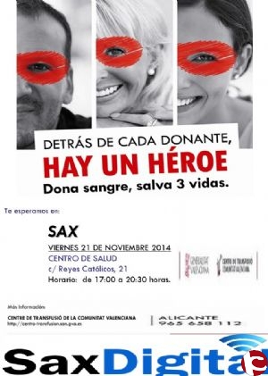 Viernes 21 de noviembre desde las 17:00 hasta las 20:30 horas en el centro de salud de Sax , sito en C/ Reyes Católicos 21. Por cierto, ¿aún no eres donante?, ¿a qué esperas?