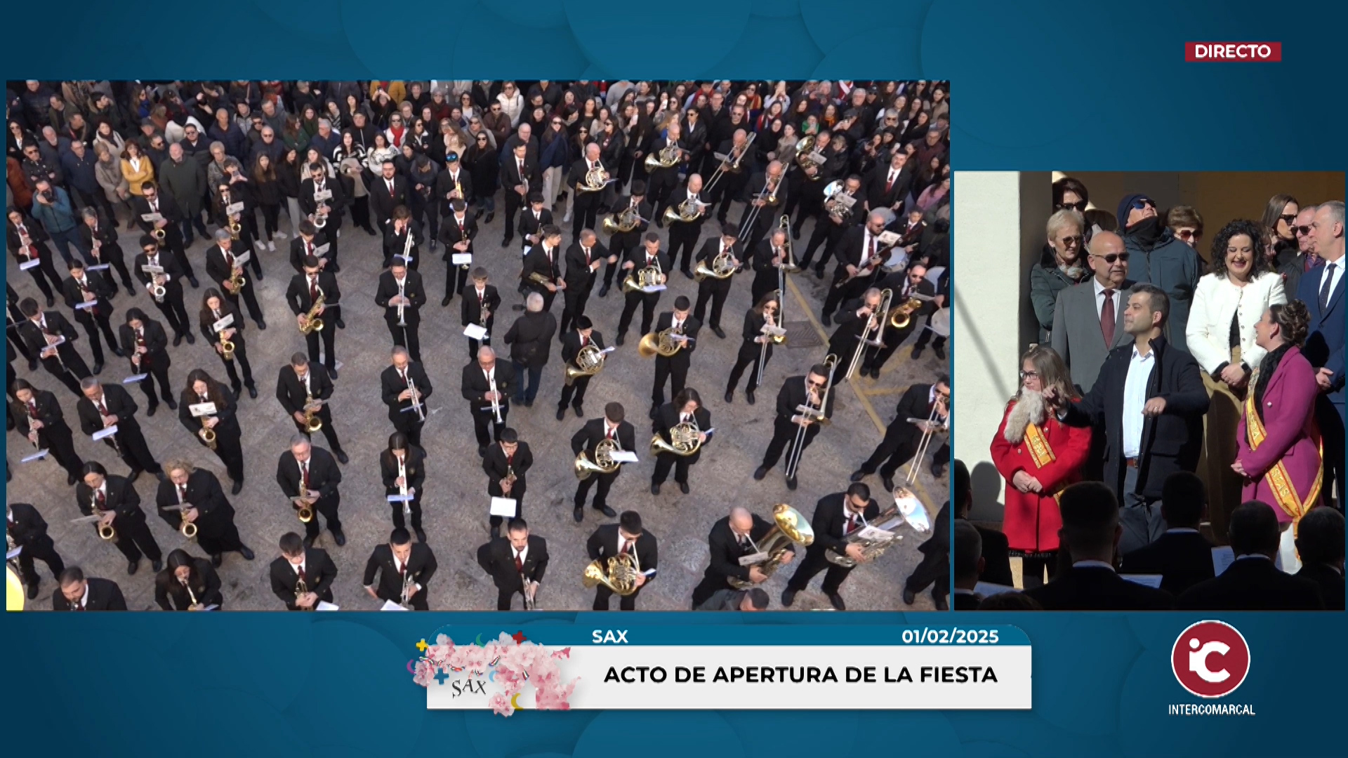 A las 11:30 de la mañana, Acto de Apertura de la Fiesta y Fiesta del Pasodoble, en la Plaza de la Constitución, se abren oficialmente las Fiestas con la intervención de la Sra. Alcaldesa, toma de posesión del Alcalde de Fiestas e izado de banderas con la interpretación del Himno Nacional. Seguidamente suena el Himno a la Fiesta a cargo de la Unión Musical y Artística de Sax. Después, las ocho bandas de música oficiales de las comparsas interpretan sendos pasodobles.