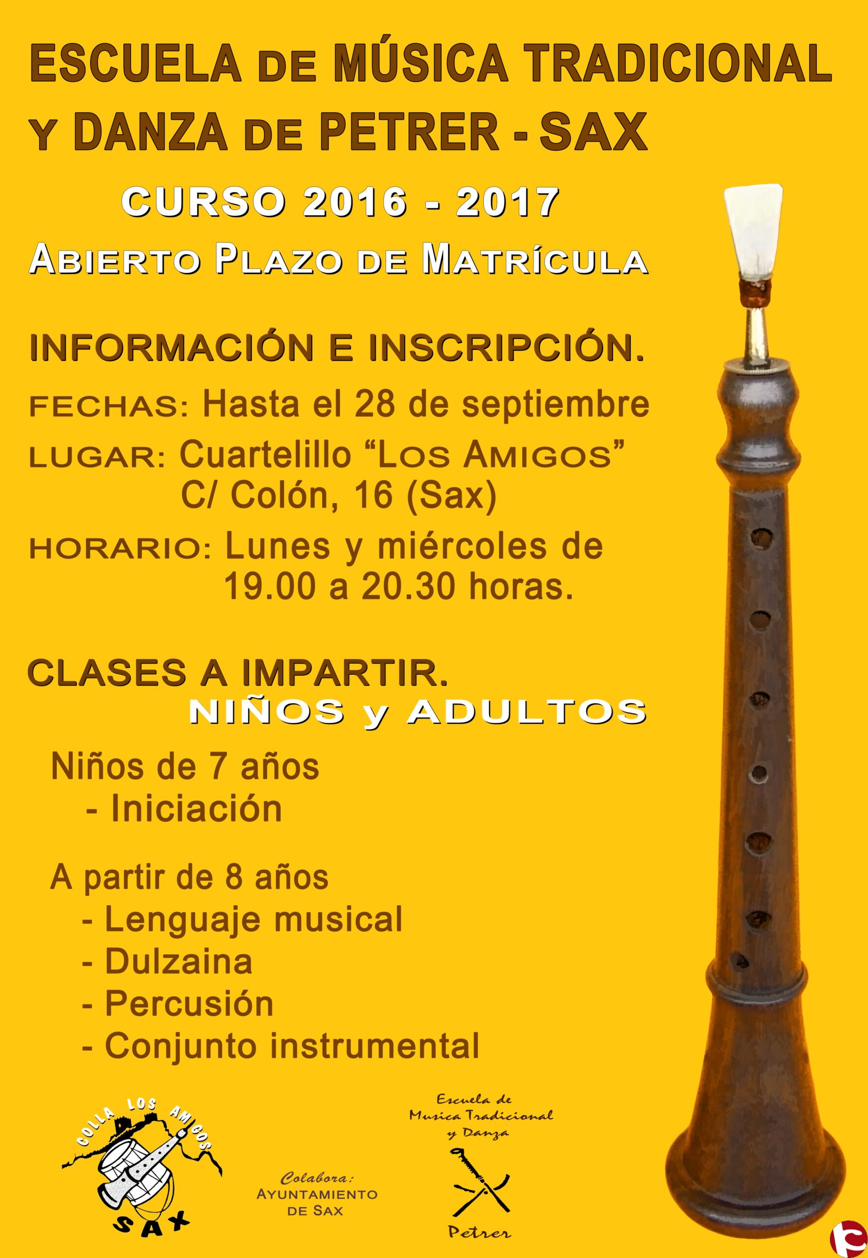 Por un lado “Los Amigos” que, con sus más de 10 años de vida, ya han logrado hacerse un hueco en el mundo de la dulzaina y por otro la Escuela de Música Tradicional y Danza de Petrer, con más de 30 años de experiencia, impulsan, con el apoyo del Ilustrísimo Ayuntamiento de Sax, el inicio de un nuevo curso de esta Escuela de Música Tradicional y Danza en Sax. El plazo de matrícula e inscripción se encontrará abierto hasta el próximo 28 de septiembre y podrán apuntarse todas aquellas personas y niños con ilusión por disfrutar de la música tradicional y de nuestros instrumentos populares; para hacerlo deben pasarse por el Cuartelillo “Los Amigos” (calle Colón, nº 16 de Sax), lunes o miércoles de 19:00 a 20:30 horas.