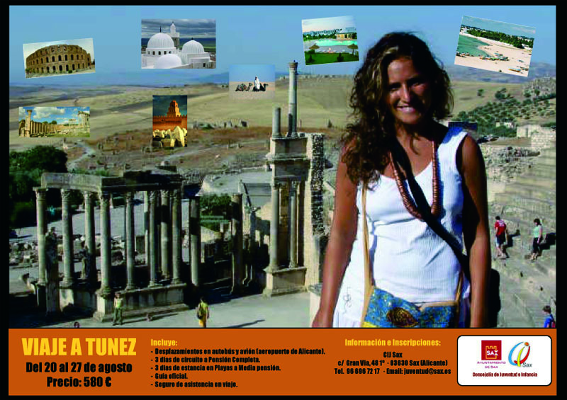La Concejalía de Juventud e Infancia ha organizado para el mes de agosto un nuevo viaje, con el fin de que los más jóvenes puedan viajar y conocer diferentes países a un precio muy asequible y rodeados de amig@s. Este año el destino es Túnez, un país exótico pero acogedor, de gente amable y hospitalaria, diferente pero cercano, con el embrujo del mundo árabe enclavado en el corazón del Mediterráneo.