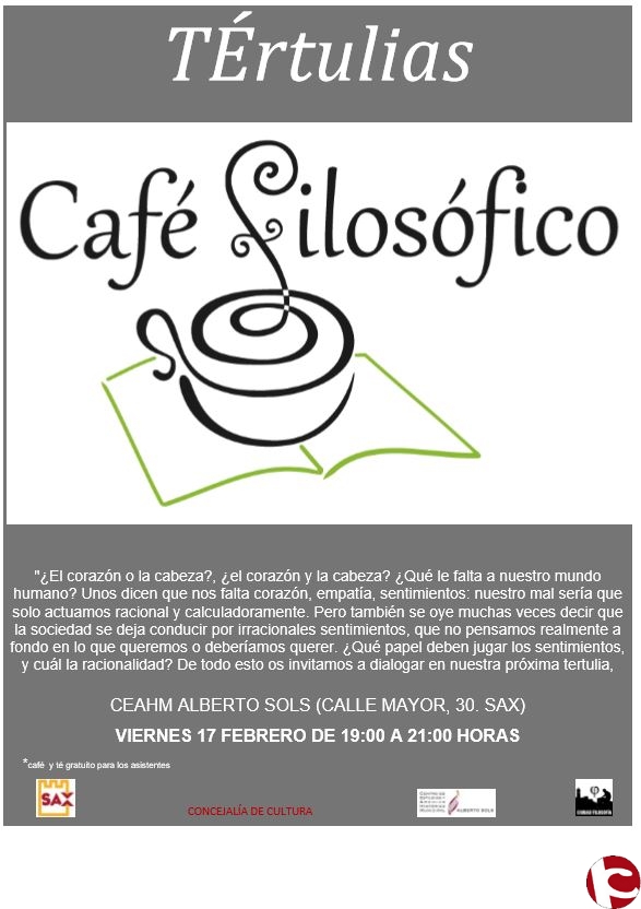 El próximo viernes 17 de febrero se llevarán a cabo en el CEAHM Alberto Sols de Sax, las tertulias filosóficas organizadas por el profesor de filosofía del IES Pascual Carrión, Juan Antonio Negrete. El tema en esta ocasión es: